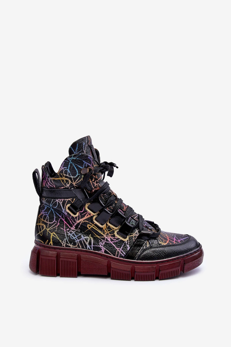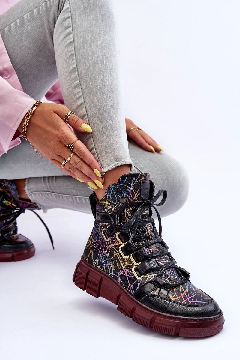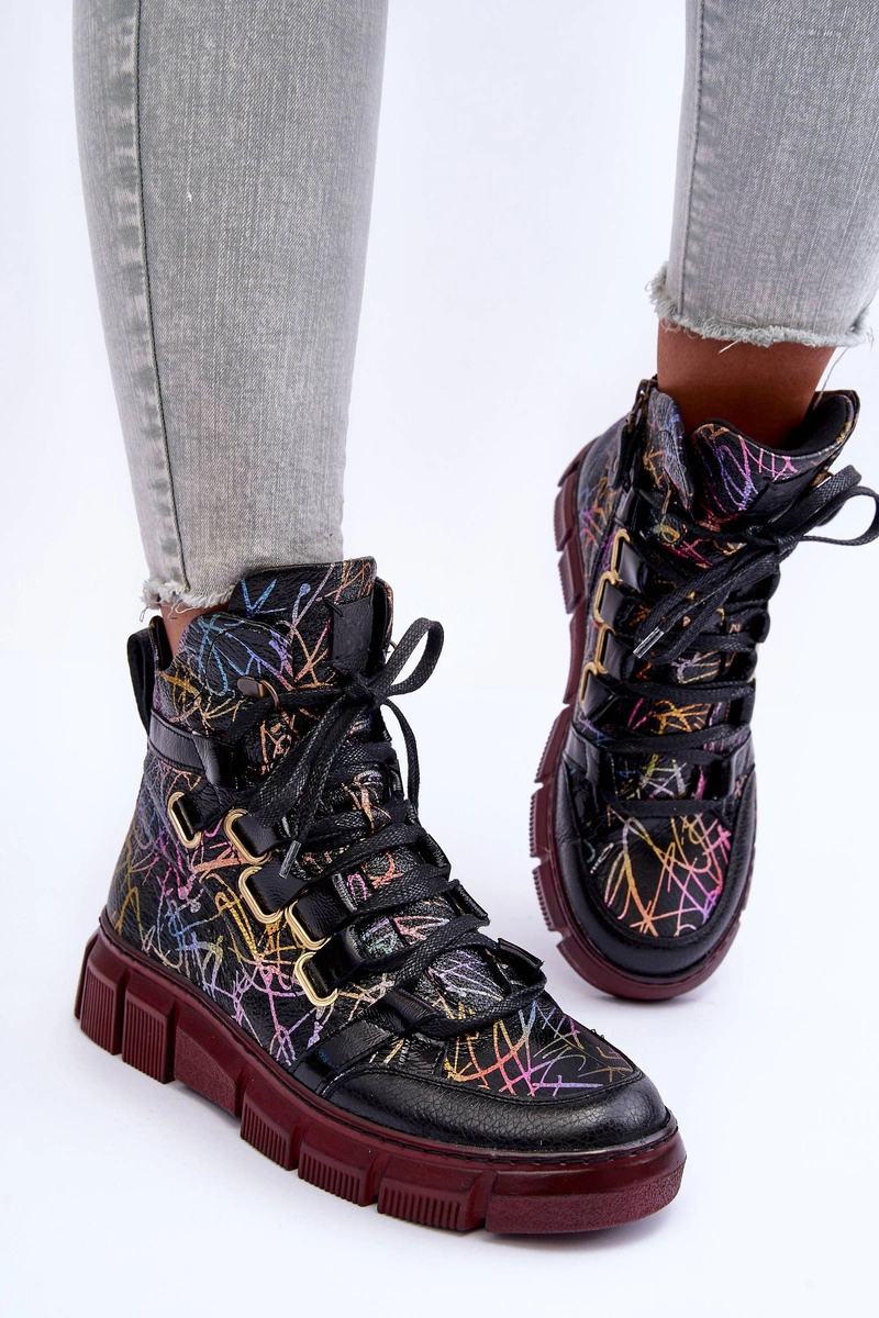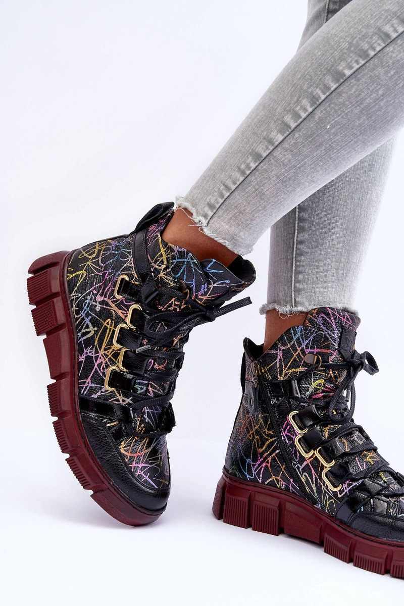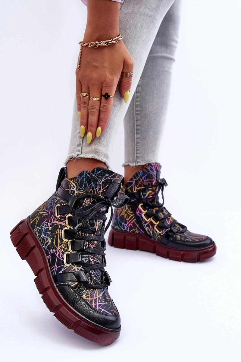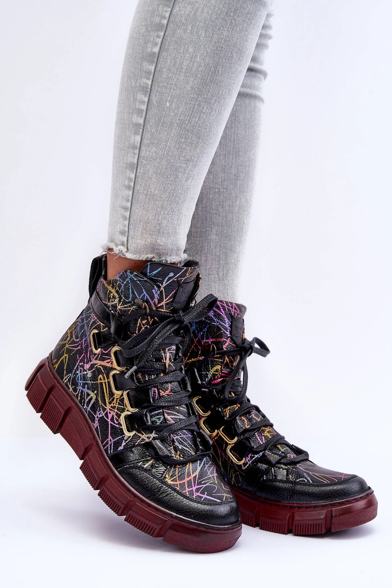 Skórzane Płaskie Sznurowane Botki Maciejka 06158-01 Czarne