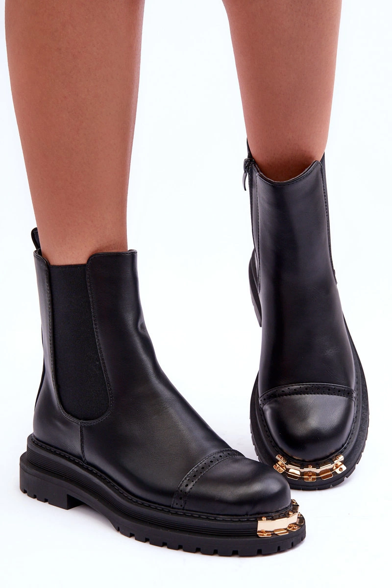 Damskie sztyblety zostały wykonane z eko skóry. Zapinane na suwak po wewnętrznej stronie cholewki. Osadzone na płaskim obcasie i platformie. Z przodu złota ozdoba z tworzywa sztucznego. Noski zaokrąglone. Ten model powinien znaleźć się w Twojej szafie! Przy wyborze rozmiaru prosimy sugerować się tabelą rozmiarów.