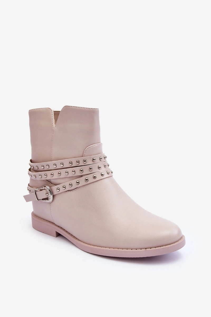 Zdobione Skórzane Botki Damskie Na Płaskim Obcasie Beżowe Adkrana