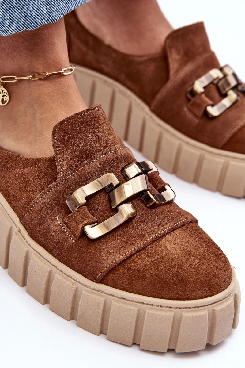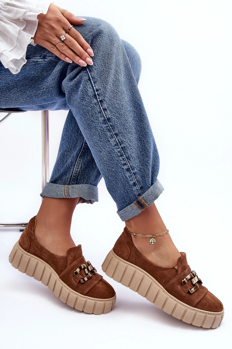 Zamszowe Półbuty Damskie Na Platformie Z Ozdobą Brązowe Lewski 3398