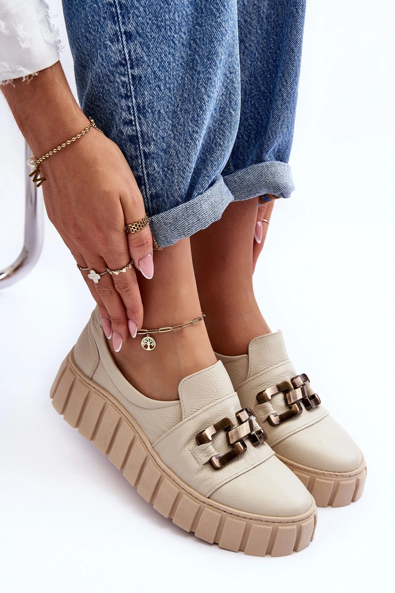 Skórzane Półbuty Damskie Na Platformie Z Ozdobą Beżowe Lewski 3398