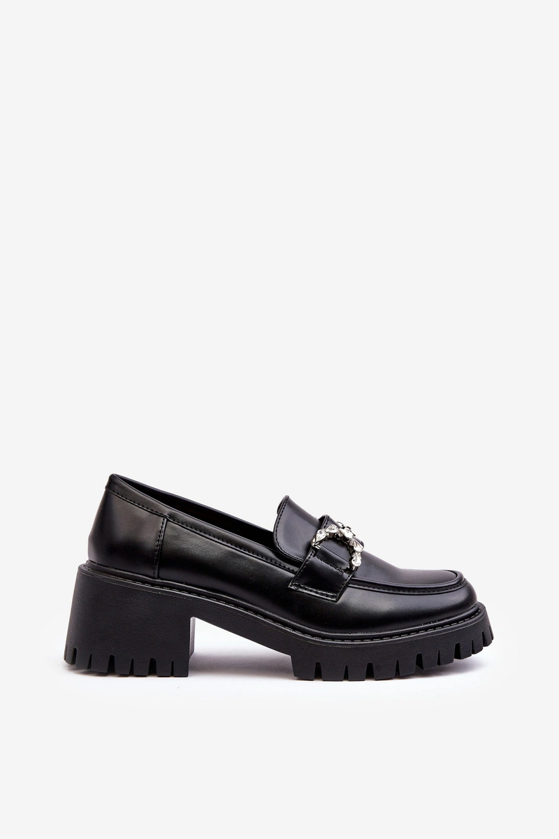 Półbuty damskie wykonane z eko skóry. Osadzone na masywnym, niskim obcasie i platformie. Z przodu na pasku biżuteryjna ozdoba. Noski zaokrąglone. Usztywniony zapiętek. Z tym modelem stworzysz wiele świetnych jesiennych stylizacji! Przy wyborze rozmiaru prosimy sugerować się tabelą rozmiarów.