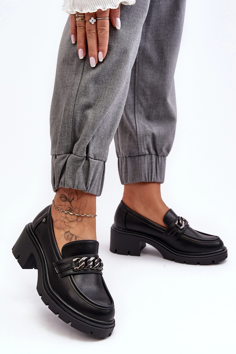 Półbuty damskie osadzone na niskim, masywnym obcasie. Wykonane z eko skóry. Z przodu na pasku ozdoba w postaci łańcucha. Noski zaokrąglone. Eko skórzana, miękka wkładka zapewni komfort podczas użytkowania. Dodatkowo zapiętek jest usztywniony. Przy wyborze rozmiaru prosimy sugerować się tabelą rozmiarów.