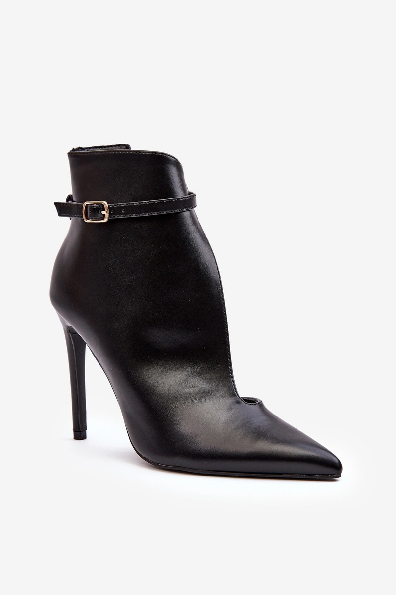 Stylowe botki damskie z wycięciem na cholewce. Wykonane z eko skóry. Osadzone na obcasie w postaci szpilki. Noski w szpic optycznie wysmuklą nogi. Na górze cholewki cienki pasek z klamrą. Miękka eko skórzana wkładka zapewni komfort podczas użytkowania. Przy wyborze rozmiaru prosimy sugerować się tabelą rozmiarów.