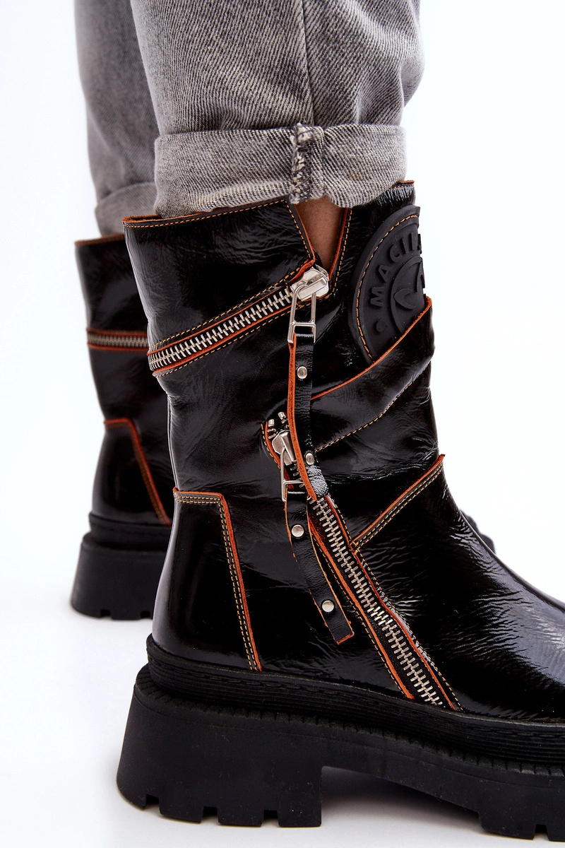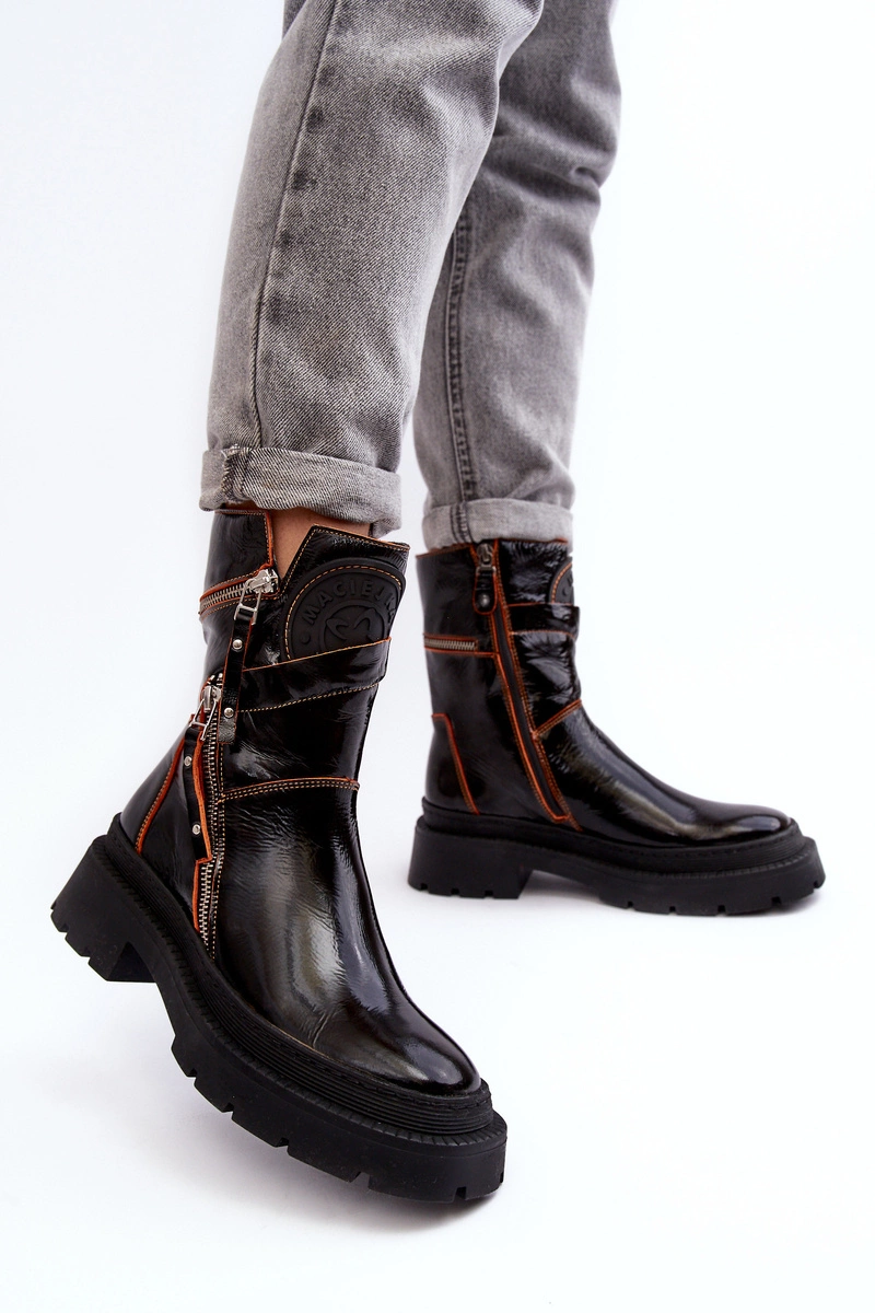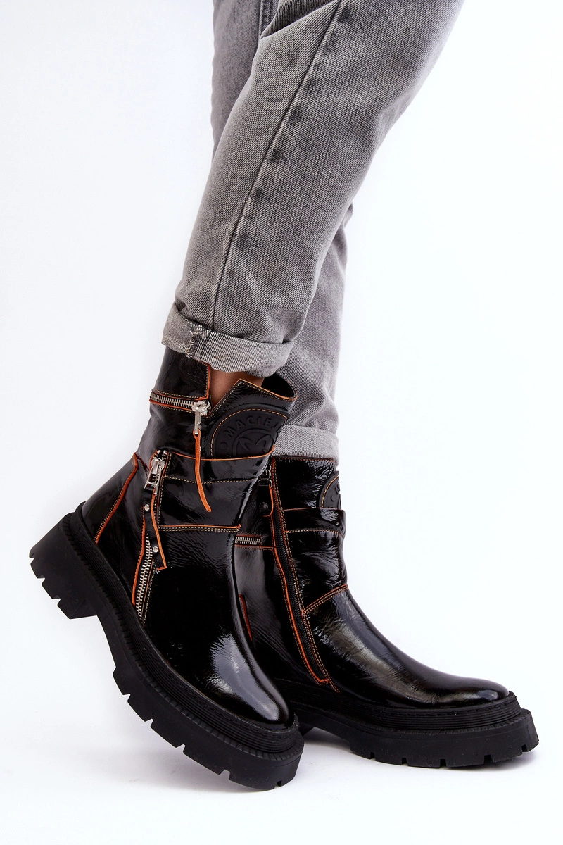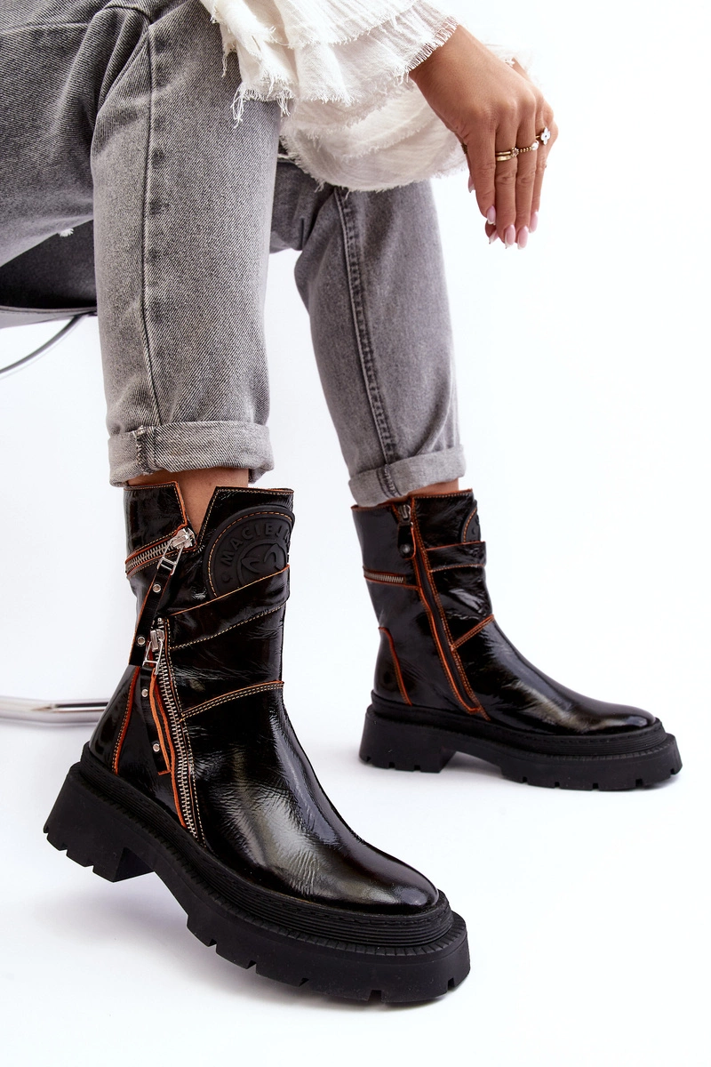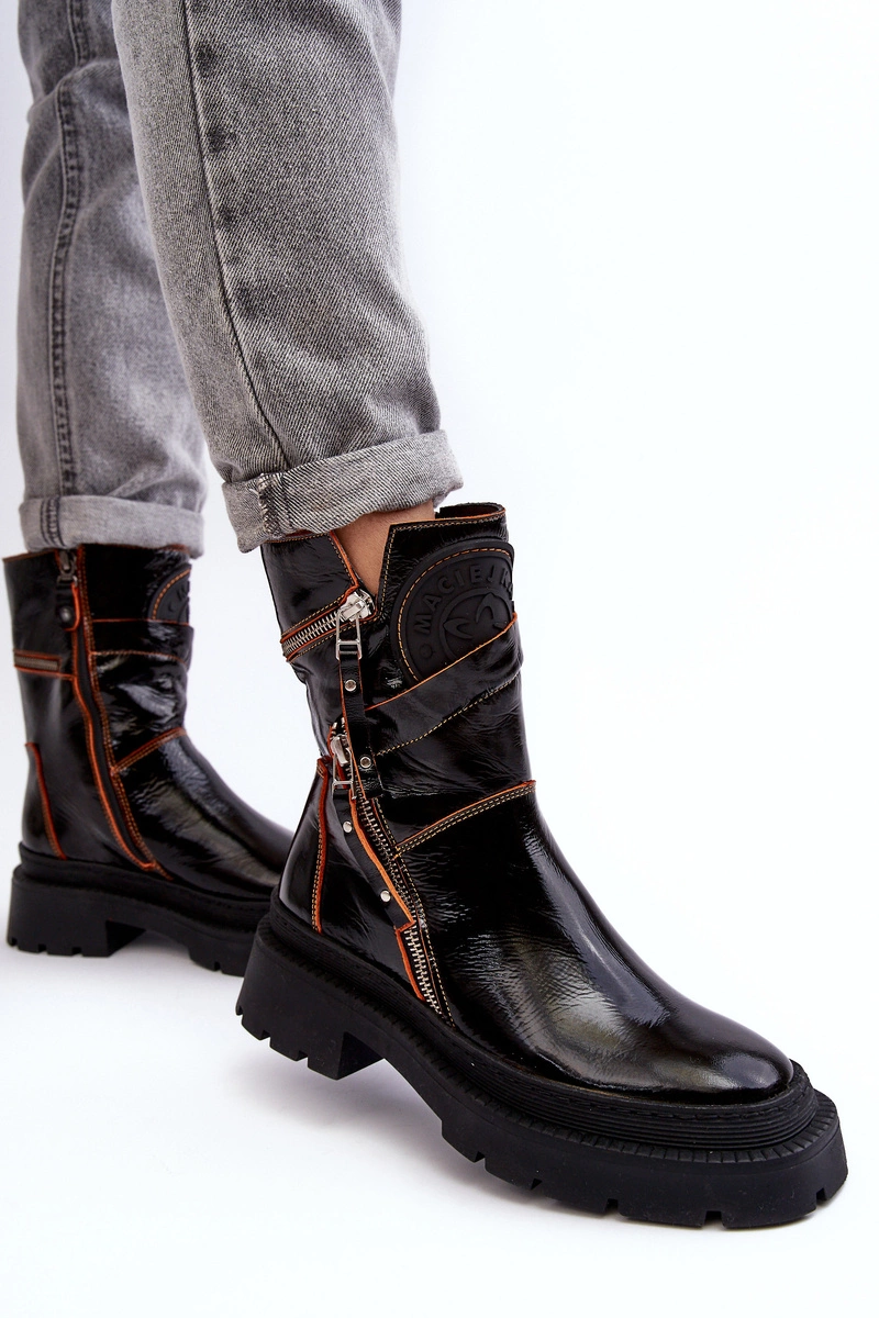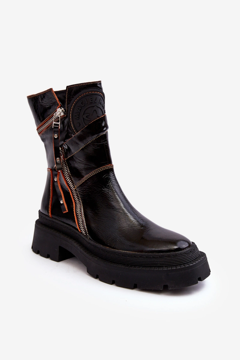 Damskie Lakierowane Skórzane Botki Z Suwakami Maciejka 06238-18 Czarne