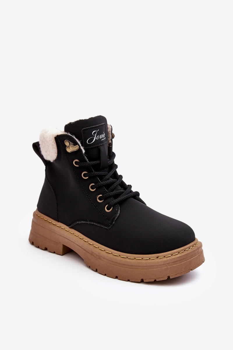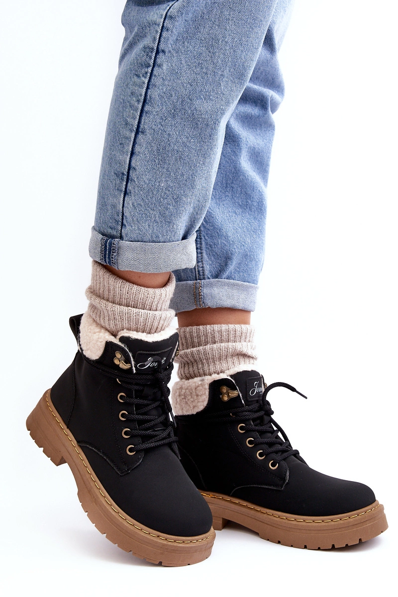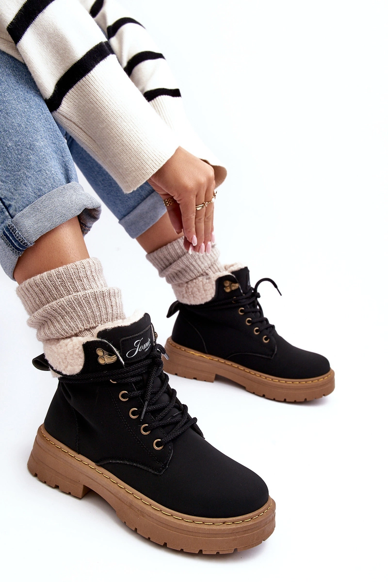 Trapery damskie wykonane z eko skóry. Osadzone na platformie oraz płaskim obcasie z gumowego tworzywa. Góra cholewki oraz wewnętrzna strona języka ocieplona syntetycznym kożuchem. Noski Zaokrąglone. Ten klasyczny model traperów zachwyci każdego! Przy wyborze rozmiaru prosimy sugerować się tabelą rozmiarów.