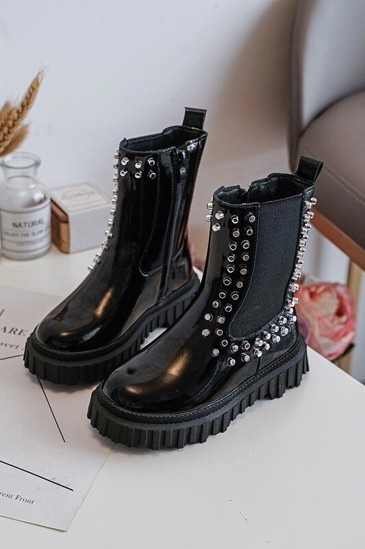 Lakierowane Botki Sztyblety Dziewczęce Zdobione Dżetami Czarne Adelie