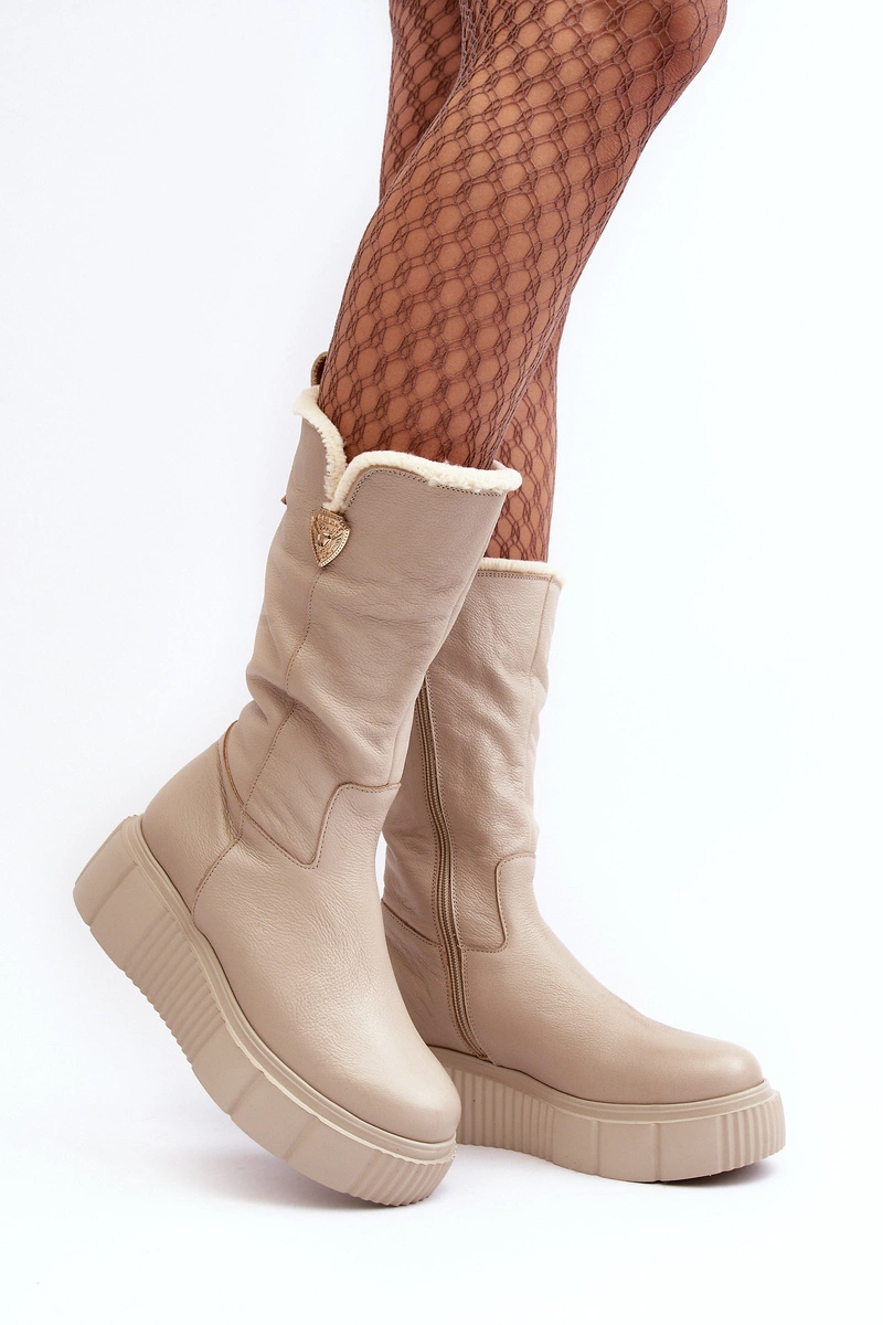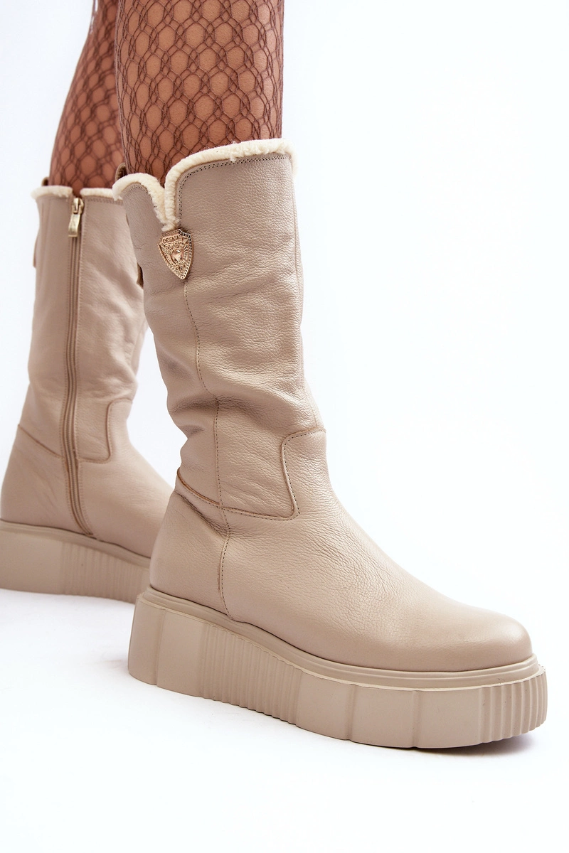 Damskie Skórzane Kozaki Z Wełną Zazoo 70121 Beżowe