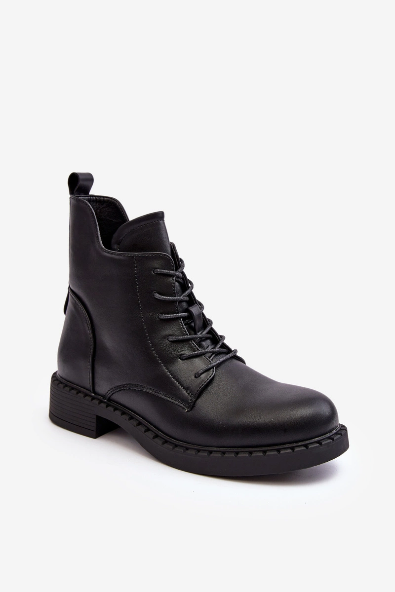 Klasyczne damskie botki na płaskim, stabilnym obcasie. Wykonane z eko skóry, Osadzone na płaskim obcasie. Cholewka za kostkę z suwakiem i sznurowaniem. Noski zaokrąglone. Środek ocieplony miłym w dotyku kocem obuwniczym. Model ten dopasujesz do wielu jesienno-zimowych stylizacji! Koniecznie powinnaś je mieć! Przy wyborze rozmiaru prosimy sugerować się tabelą rozmiarów.