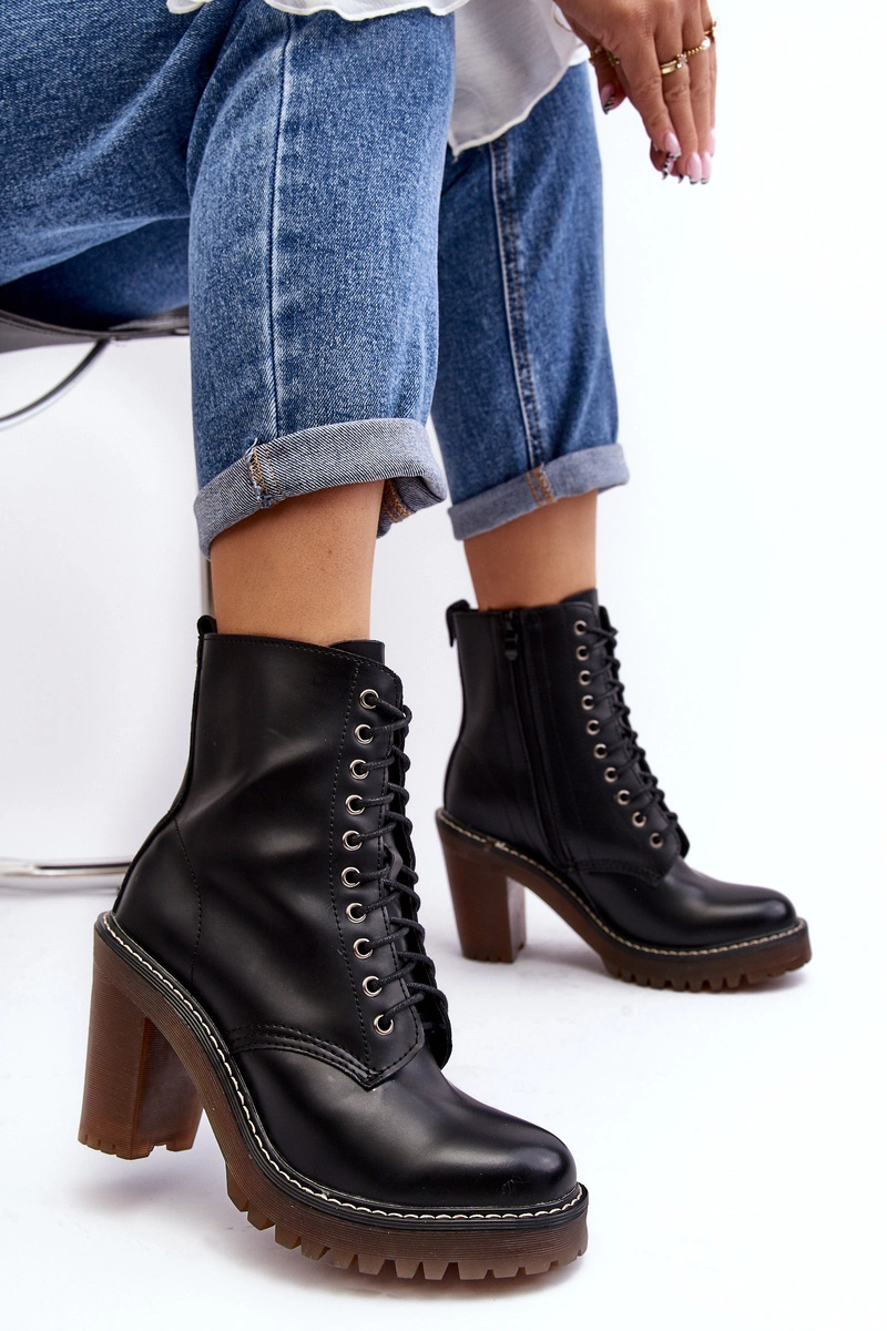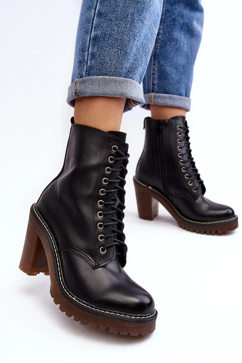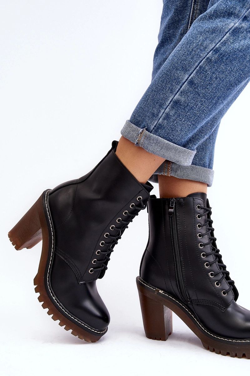Botki damskie wykonane z eko skóry. Osadzone na obcasie w postaci słupka. Cholewka za kostkę. Model zapinany na suwak z boku oraz dodatkowo posiada sznurowanie. Wkładka ocieplona kocem obuwniczym. Noski zaokrąglone. Usztywniony zapiętek. Przy wyborze rozmiaru prosimy sugerować się tabelą rozmiarów.