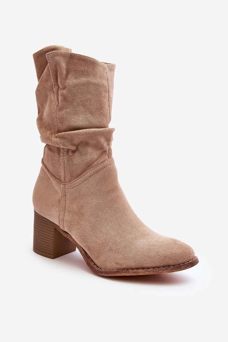 Botki Damskie Ocieplane Z Marszczoną Cholewką Na Słupku Beżowe Shavy