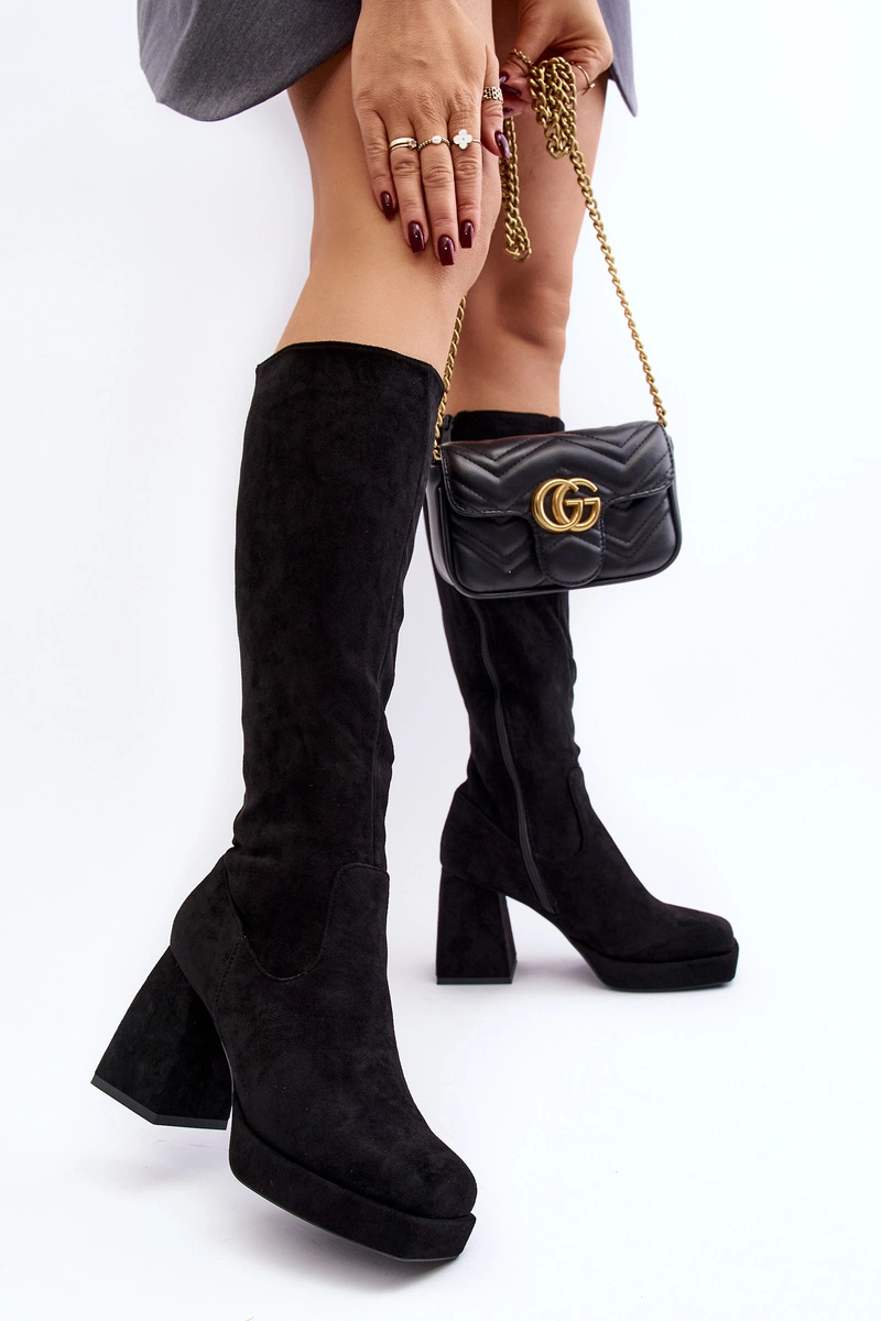 Damskie kozaki z cholewką do kolana. Osadzone na masywnym platformie i obcasie w postaci słupka. Model ten zapinany jest suwakiem z boku. W środku ocieplone kocem obuwniczym. Noski w kwadrat. Idealne do sukienek czy spódnic! Przy wyborze rozmiaru prosimy sugerować się tabelą rozmiarów.