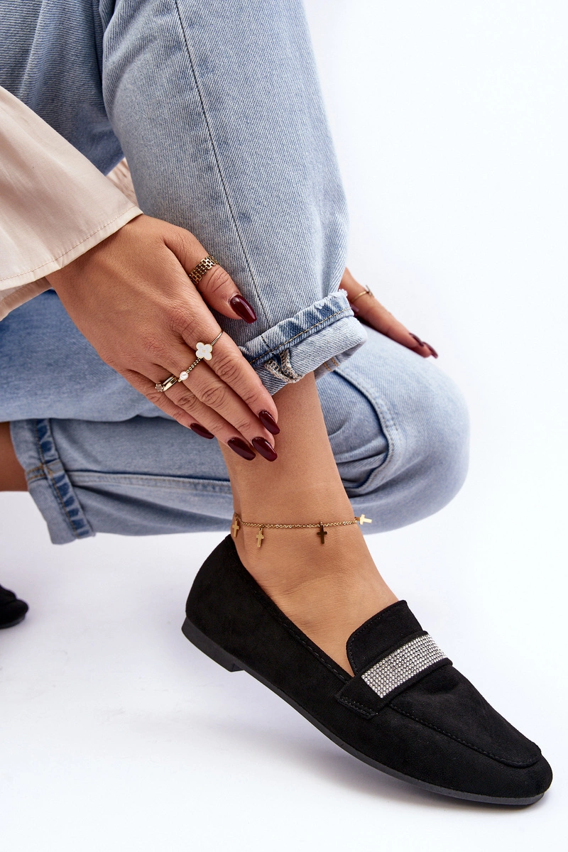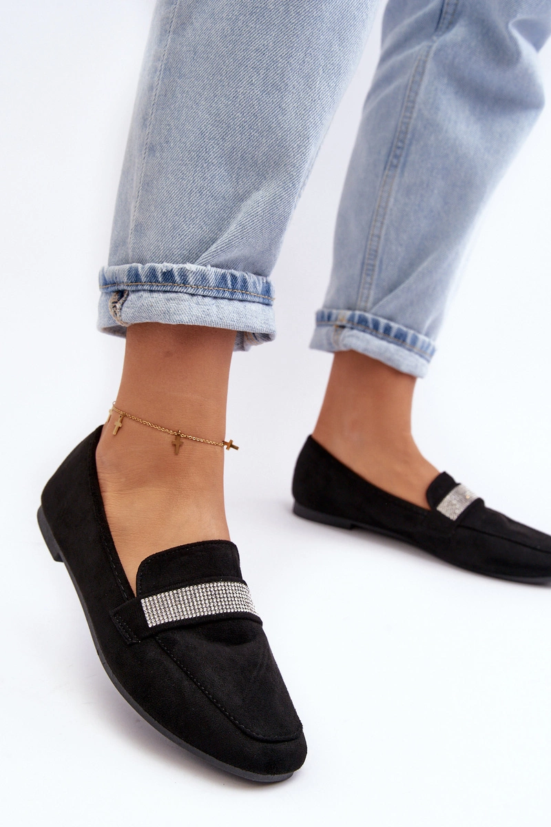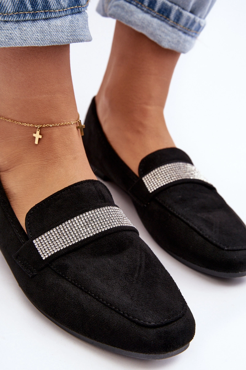 Mokasyny damskie wykonane z eko zamszu. Osadzone na płaskim obcasie. Noski zaokrąglone. Z przodu na pasku liczne, małe cyrkonie. Miękka i profilowana wkładka z eko skóry gwarantuje komfort noszenia przez cały dzień. Stylowe mokasyny to niezbędny element kobiecej garderoby! Koniecznie musisz je mieć! Przy wyborze rozmiaru prosimy sugerować się tabelą rozmiarów.