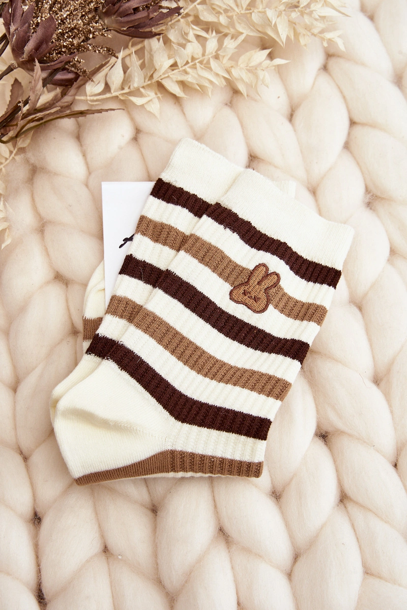 Damskie Skarpety W Paski Z Króliczkiem Kremowo-Brązowe
