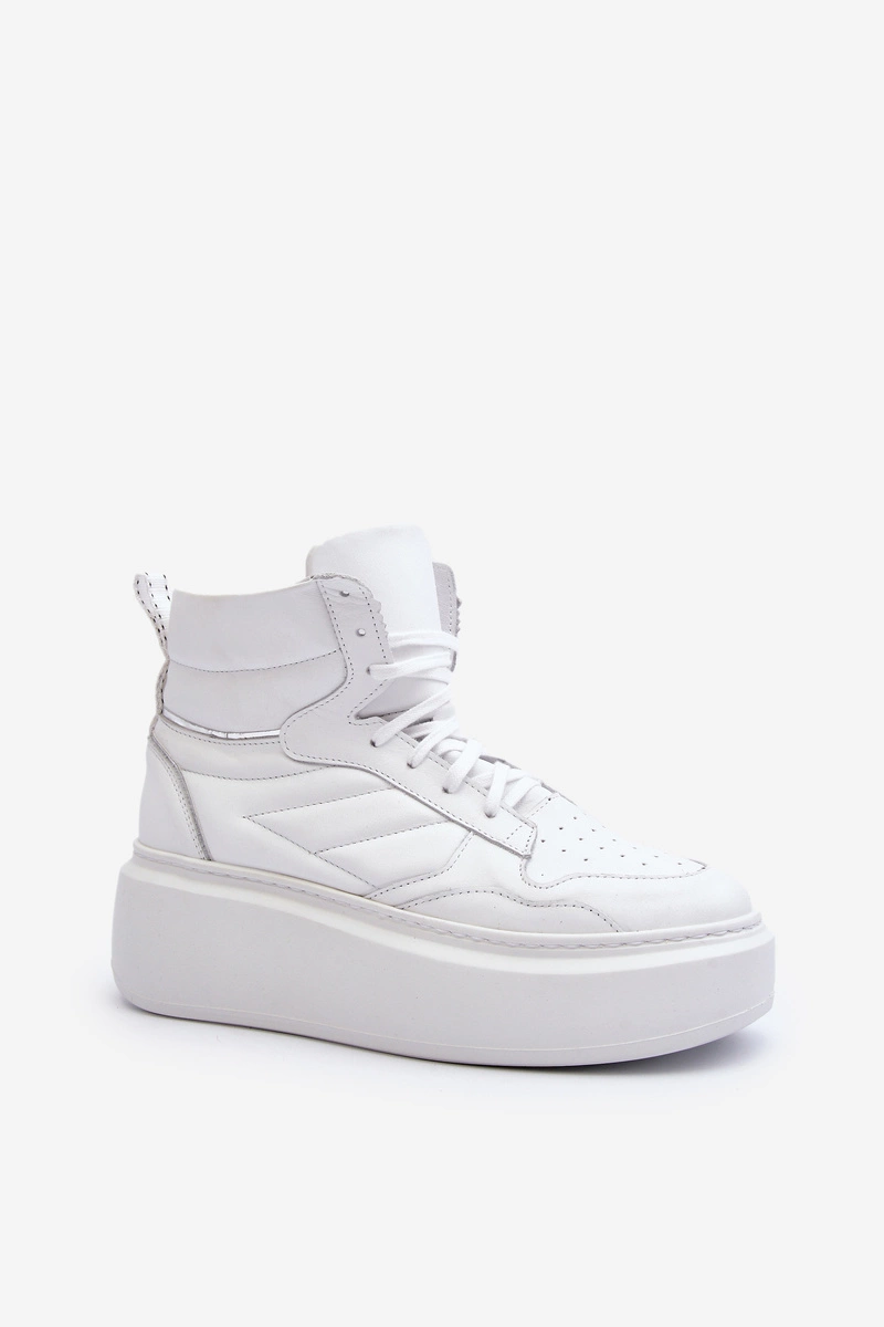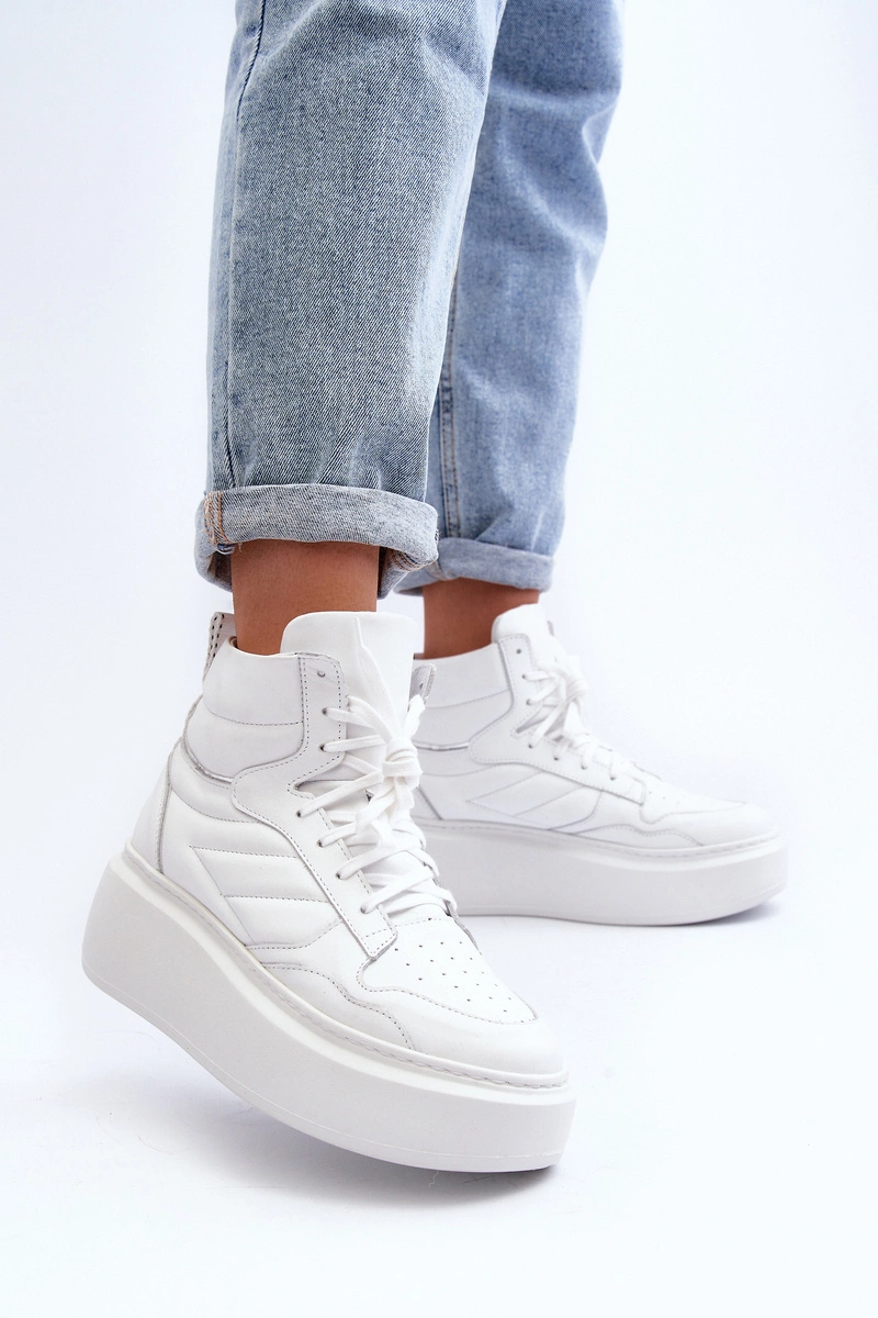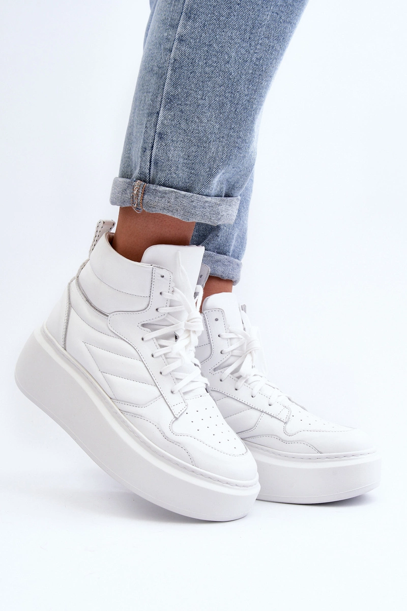 Modne buty sportowe damskie wykonane ze skóry naturalnej. Osadzone na masywnej platformie. Cholewka za kostkę. Noski zaokrąglone. Model z klasycznym sznurowaniem. Idealne na wiosenne dni! Fason ten na pewno przypadnie Ci do gustu! Przy wyborze rozmiaru prosimy kierować tabelą rozmiarów.