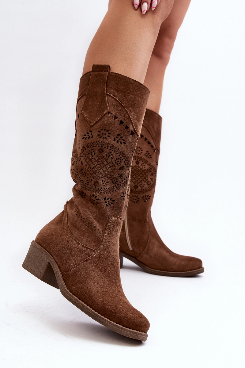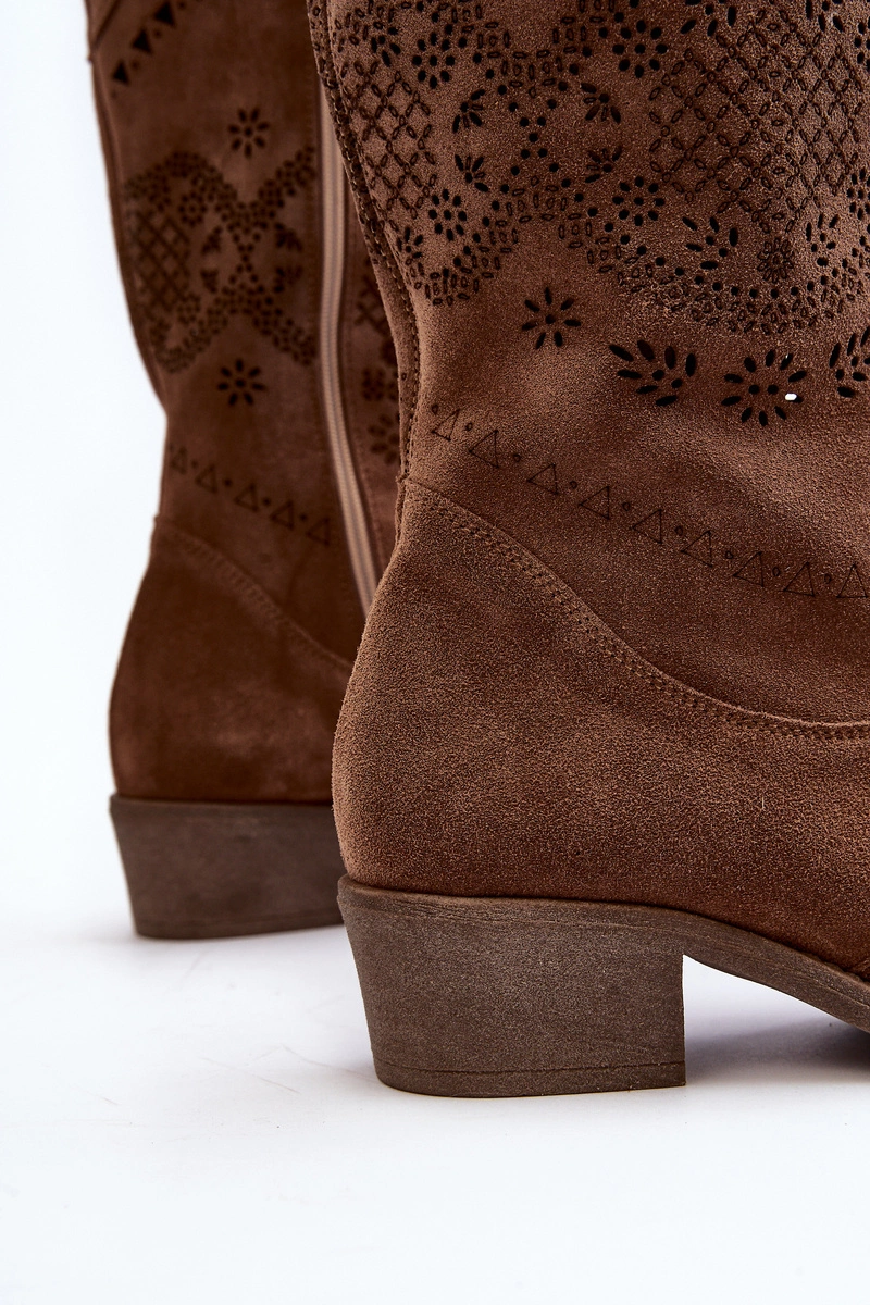 Zazoo 4043 Zamszowe Kozaki Na Niskim Obcasie Ażurowe Brązowe