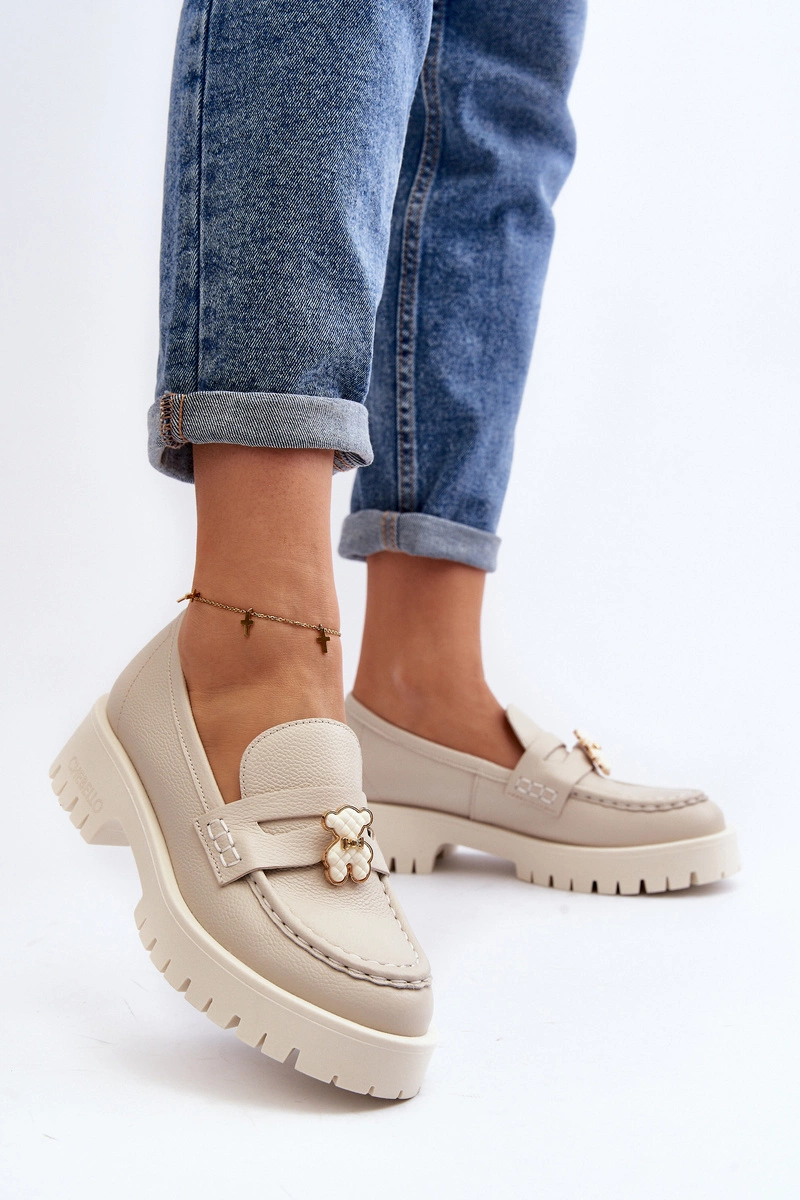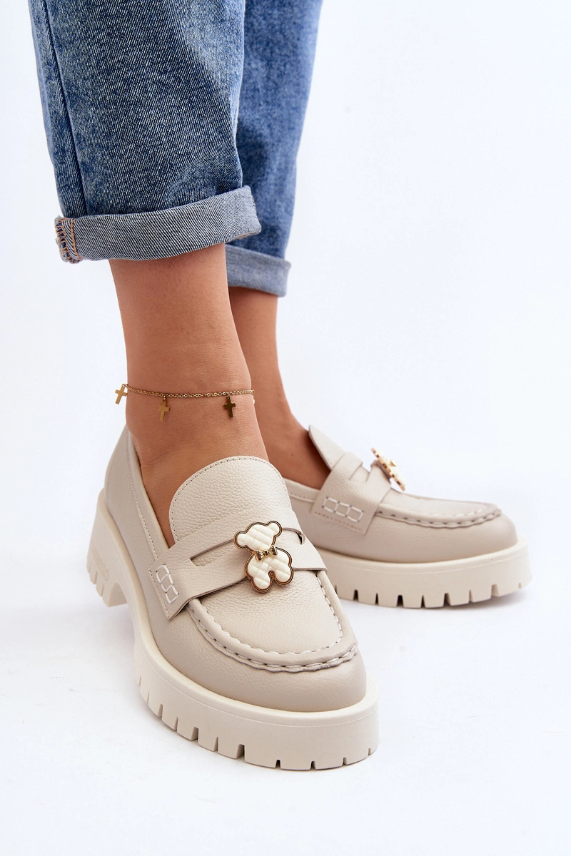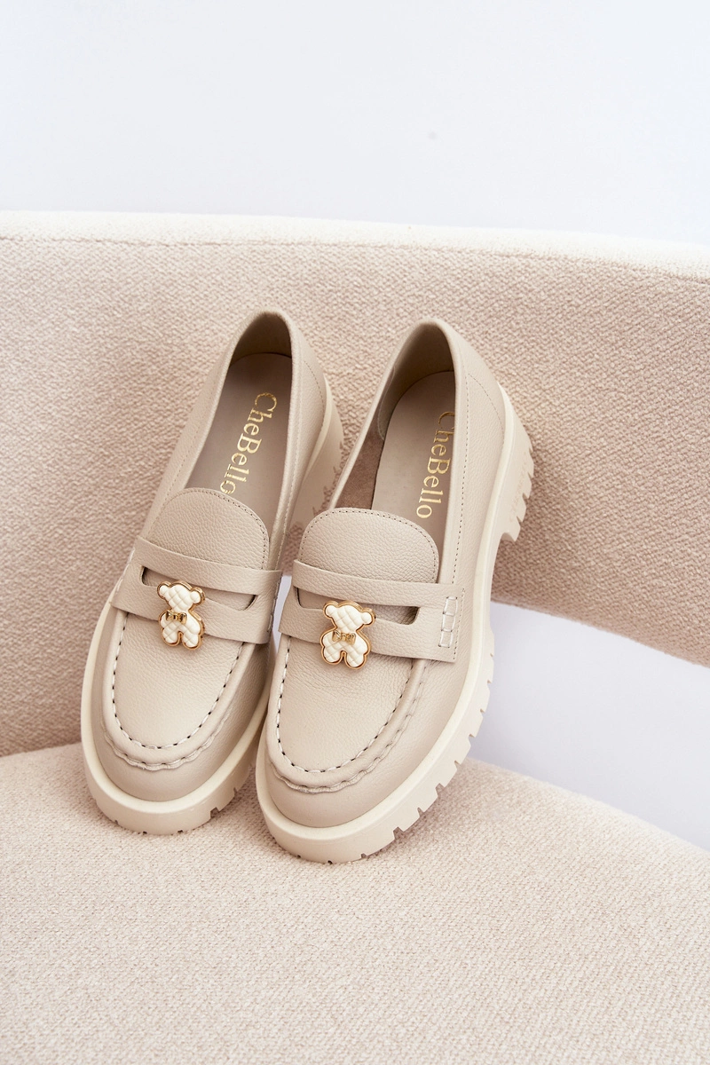 Skórzane Półbuty Mokasyny Z Misiem CheBello 4291 Jasnobeżowe
