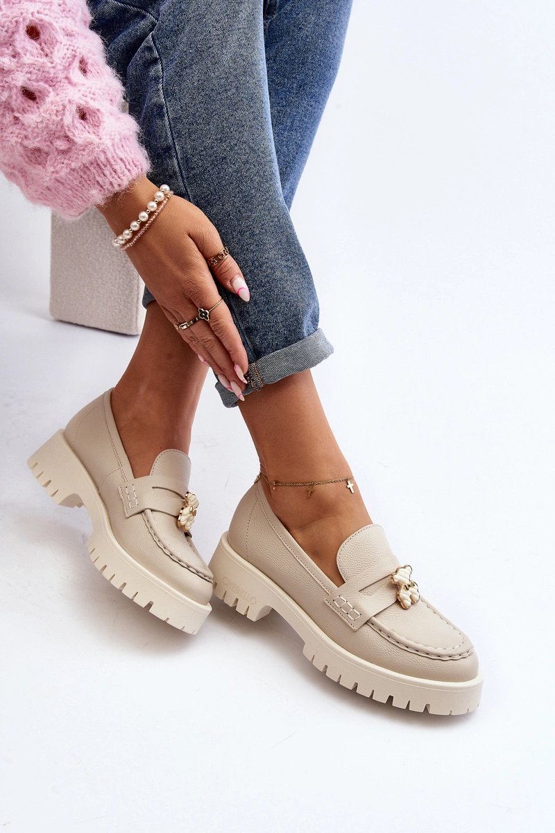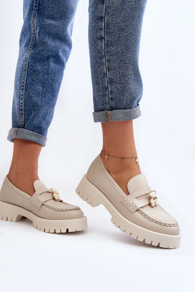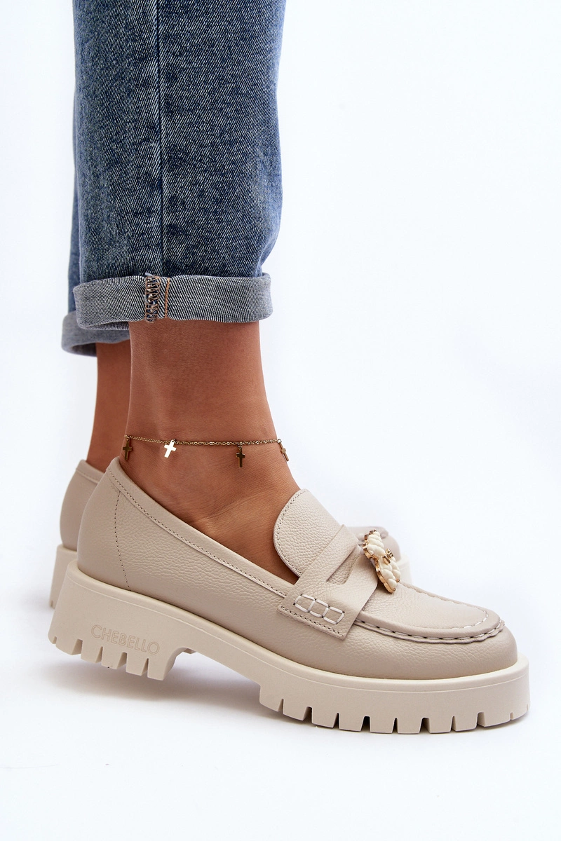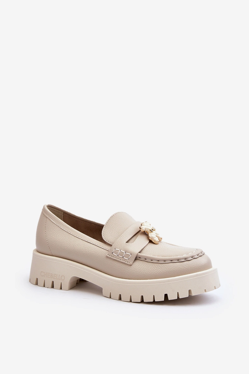 Skórzane Półbuty Mokasyny Z Misiem CheBello 4291 Jasnobeżowe