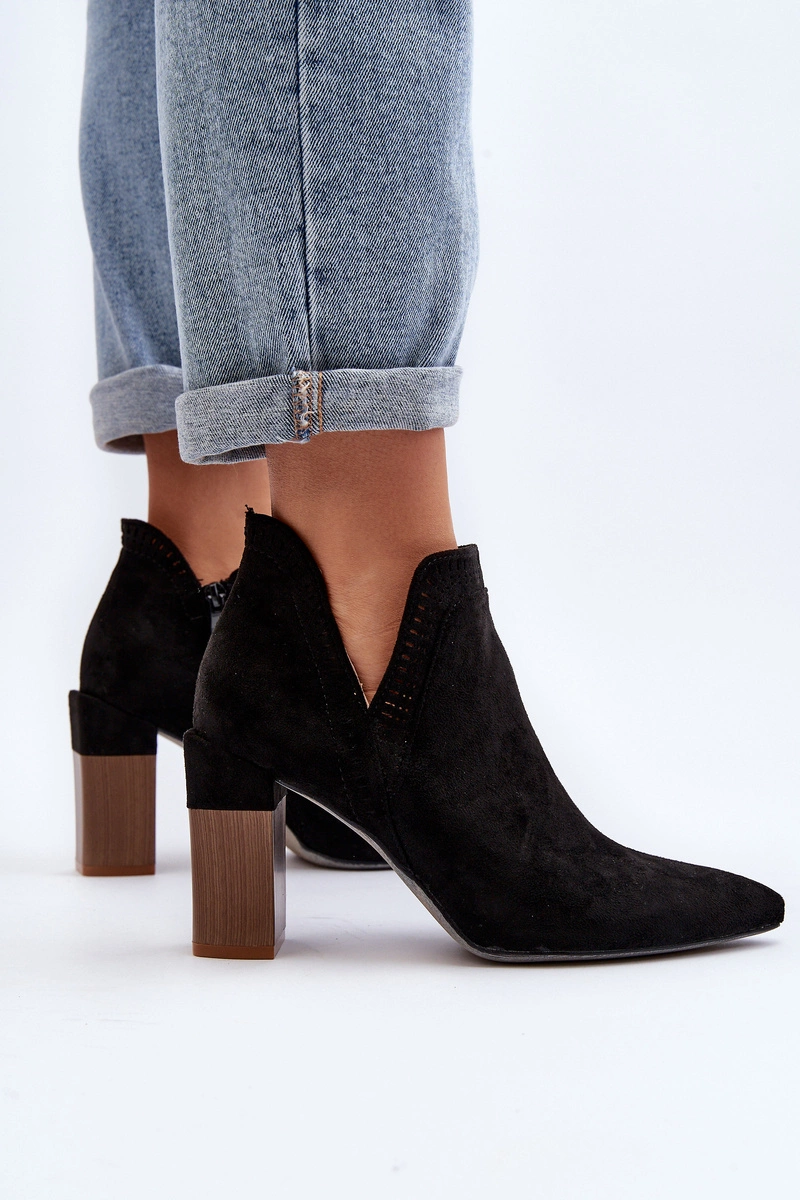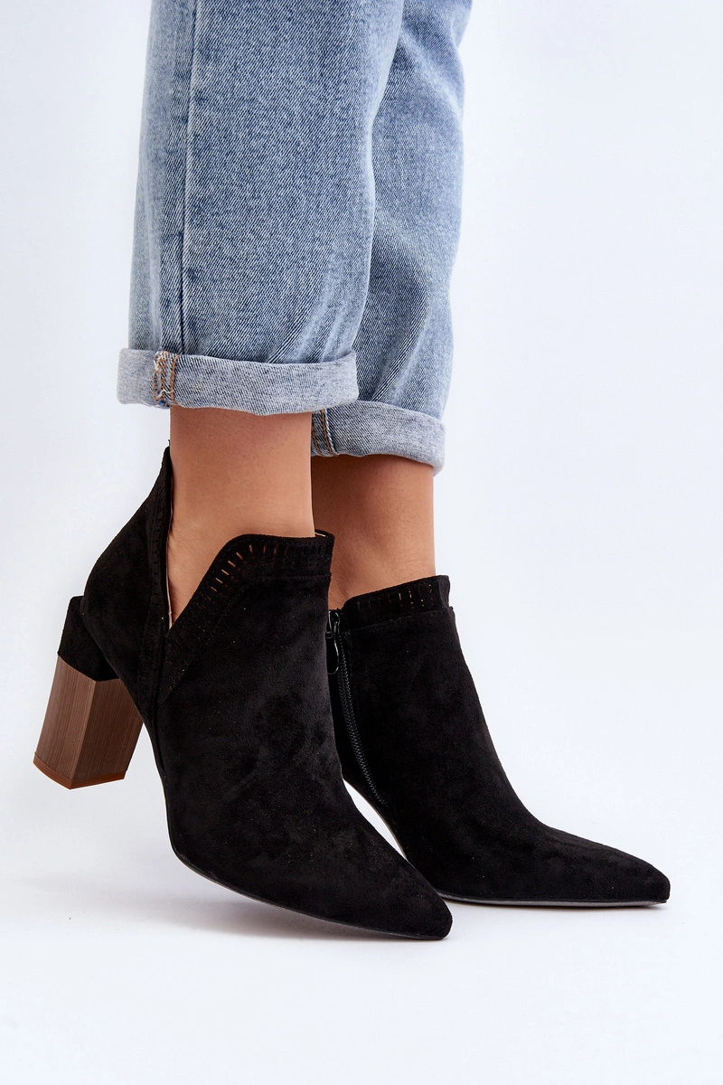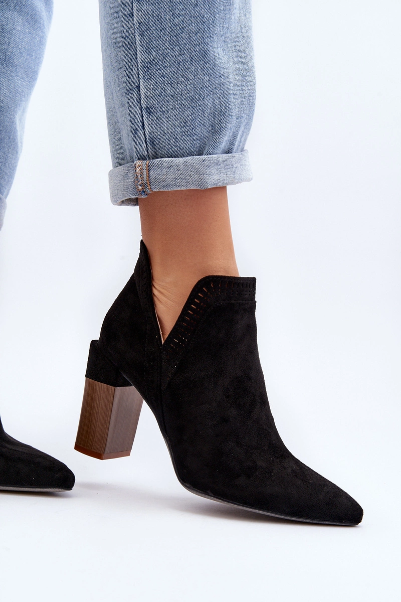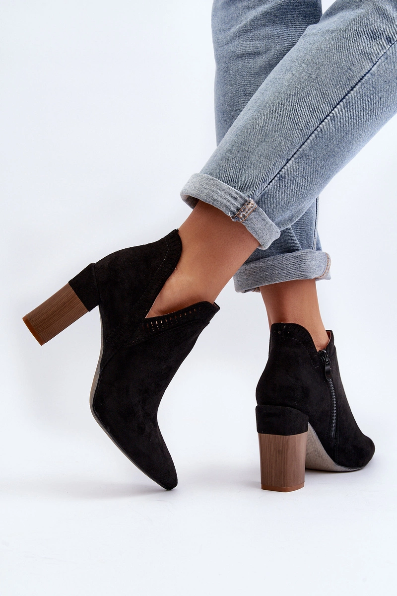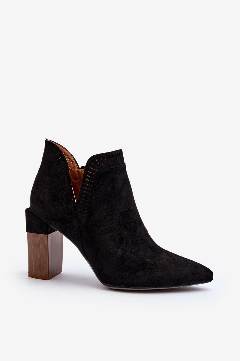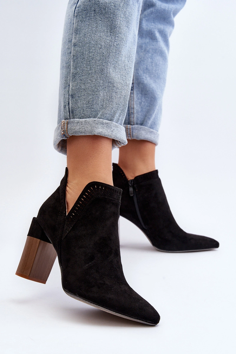 Botki damskie wykonane z eko zamszu. Osadzone na obcasie w postaci słupka. Noski w szpic optycznie wysmuklą nogi. Cholewka ozdobiona ażurowym wzorem. Zapinane na suwak z boku. Z pewnością wykorzystasz je do wielu wiosennych stylizacji! Przy wyborze rozmiaru prosimy sugerować się tabelą rozmiarów.