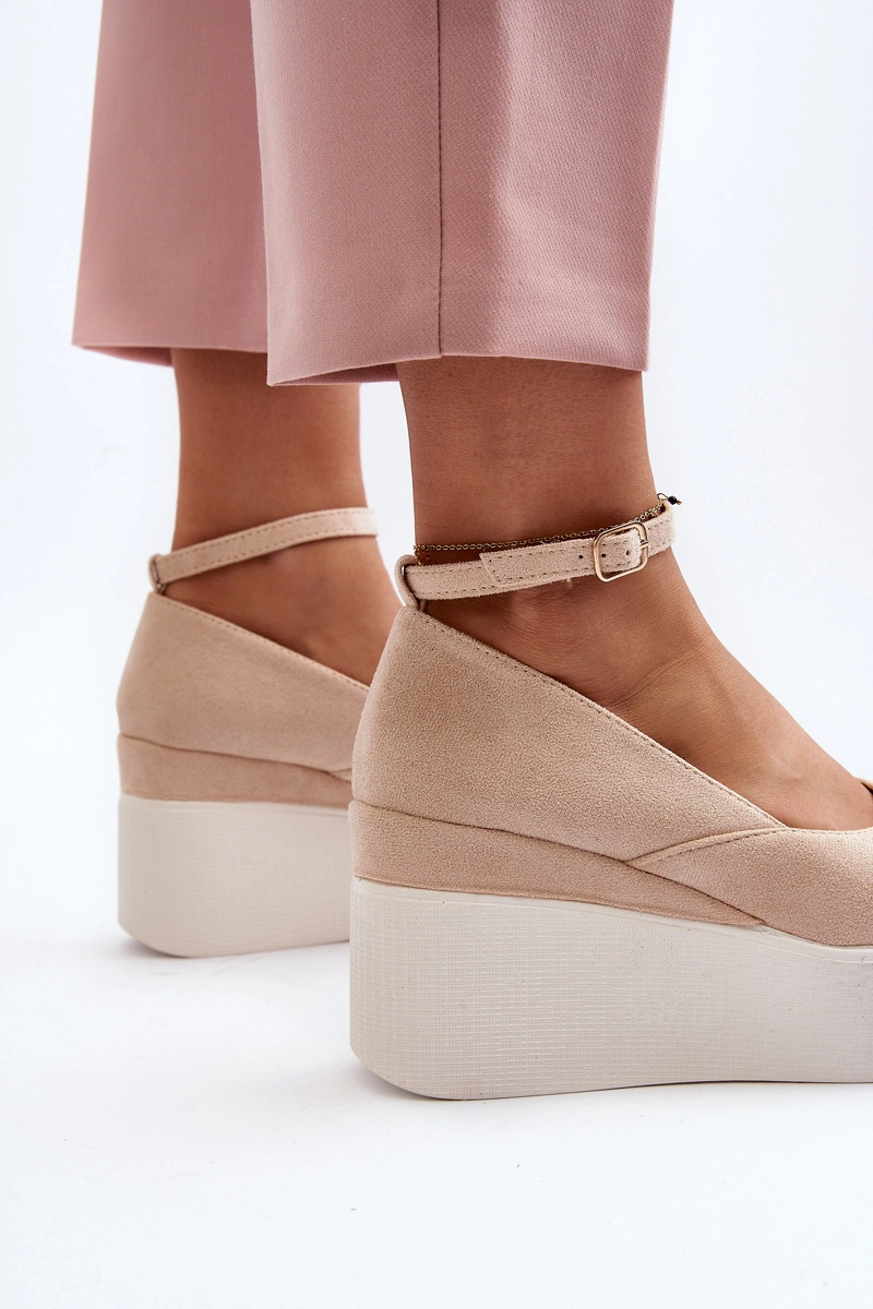 Espadryle damskie osadzone na platformie wraz z koturnem. Wykonane z eko zamszu. Noski zakryte, zaokrąglone. Zapinane na regulowany pasek ze sprzączką. Model ten posiada miękką wkładkę z eko skóry, która zapewni wygodę podczas użytkowania. Idealne do wiosenno-letnich stylizacji! Przy wyborze rozmiaru prosimy sugerować się tabelą rozmiarów.