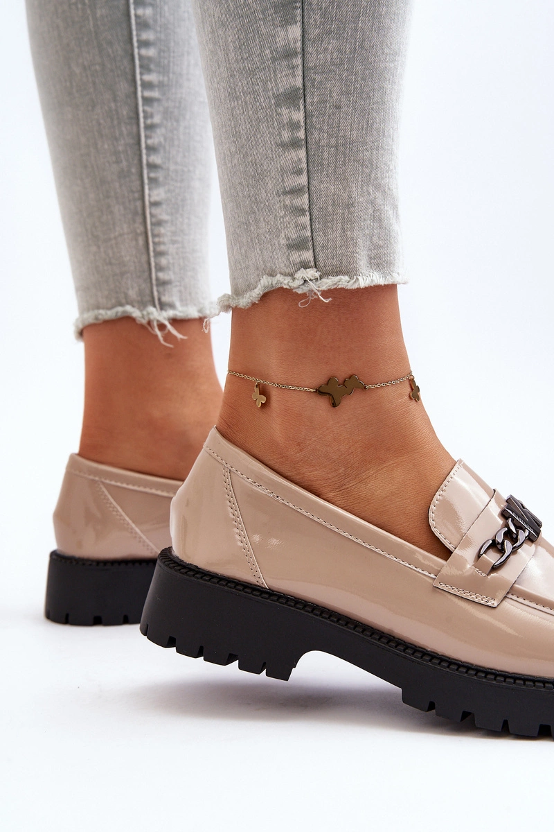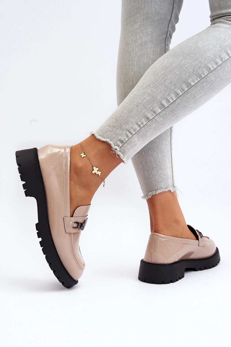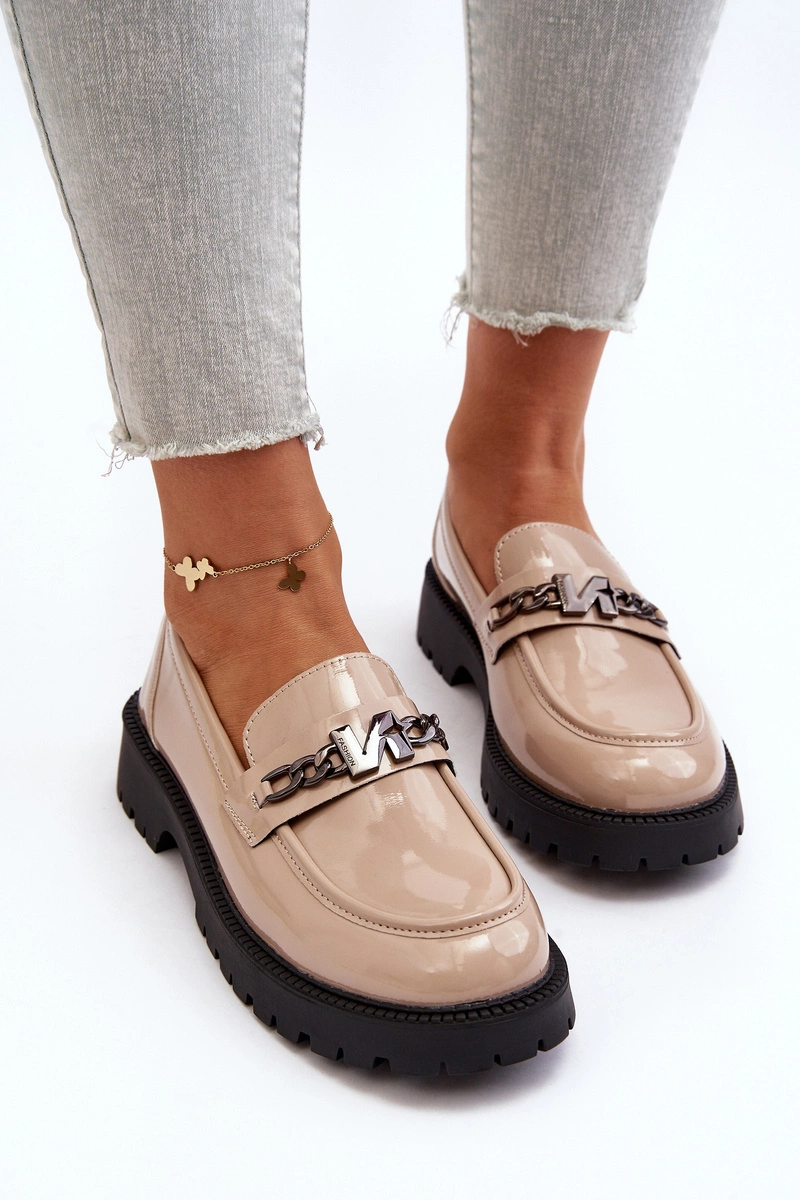 Mokasyny Lakierowane Damskie Na Płaskim Obcasie Beżowe Ezoma