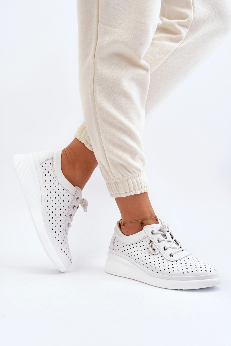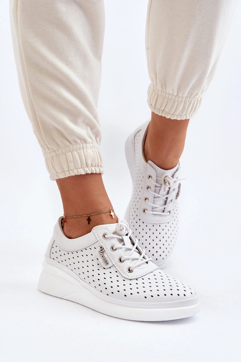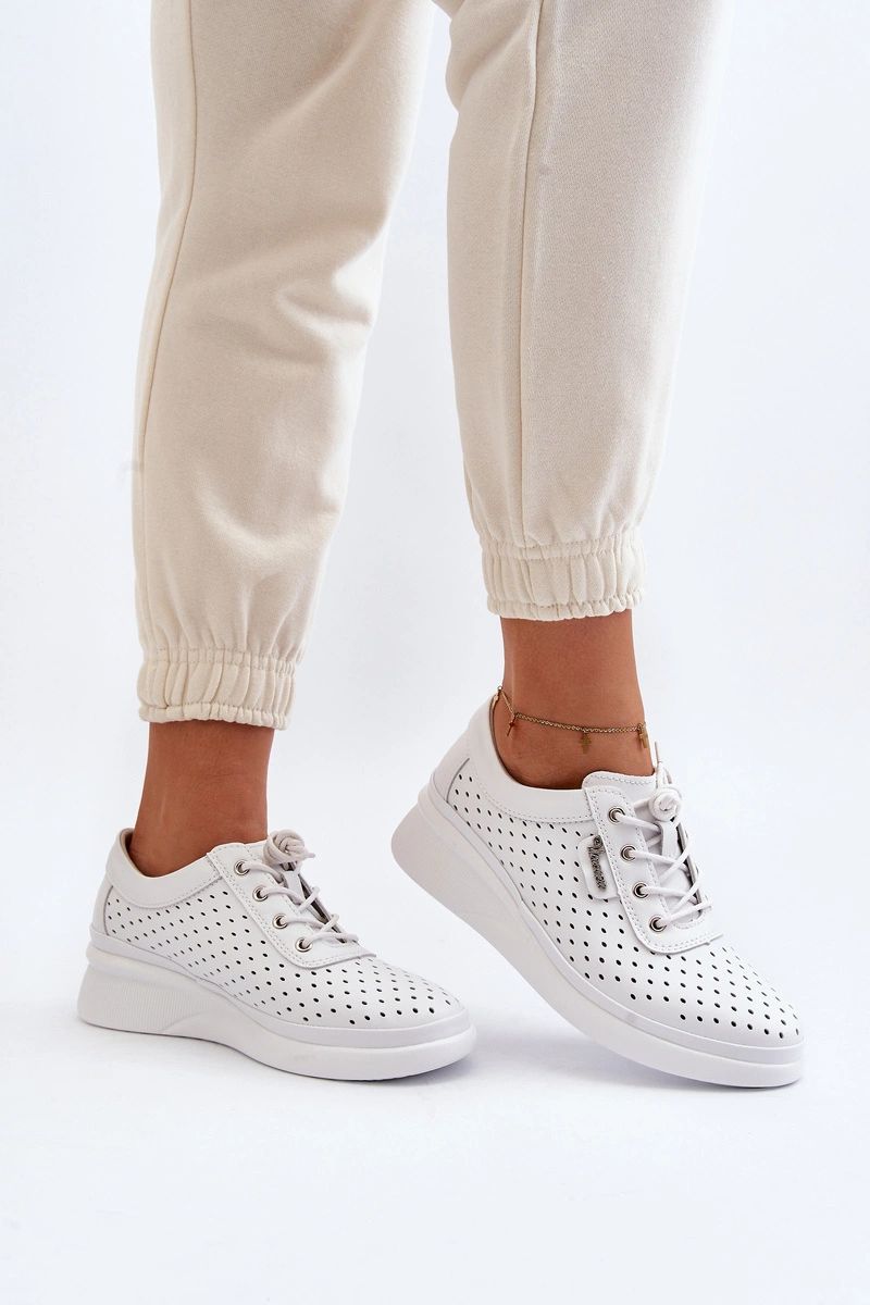 Piękne sneakersy damskie wykonane są z naturalnej skóry, która gwarantuje wysoką jakość i trwałość. Ich perforowana struktura po bokach zapewnia odpowiedni przepływ powietrza, co sprawia, że są one idealne na ciepłe dni. Model jest klasycznie sznurowany, co pozwala na idealne dopasowanie do stopy. Zaokrąglony nosek dodaje butom elegancji. Miękka, skórzana wkładka zapewnia wygodę podczas noszenia. Te modne trampki to doskonały wybór na codzienne stylizacje! Przy wyborze rozmiaru prosimy sugerować się tabelą rozmiarów.