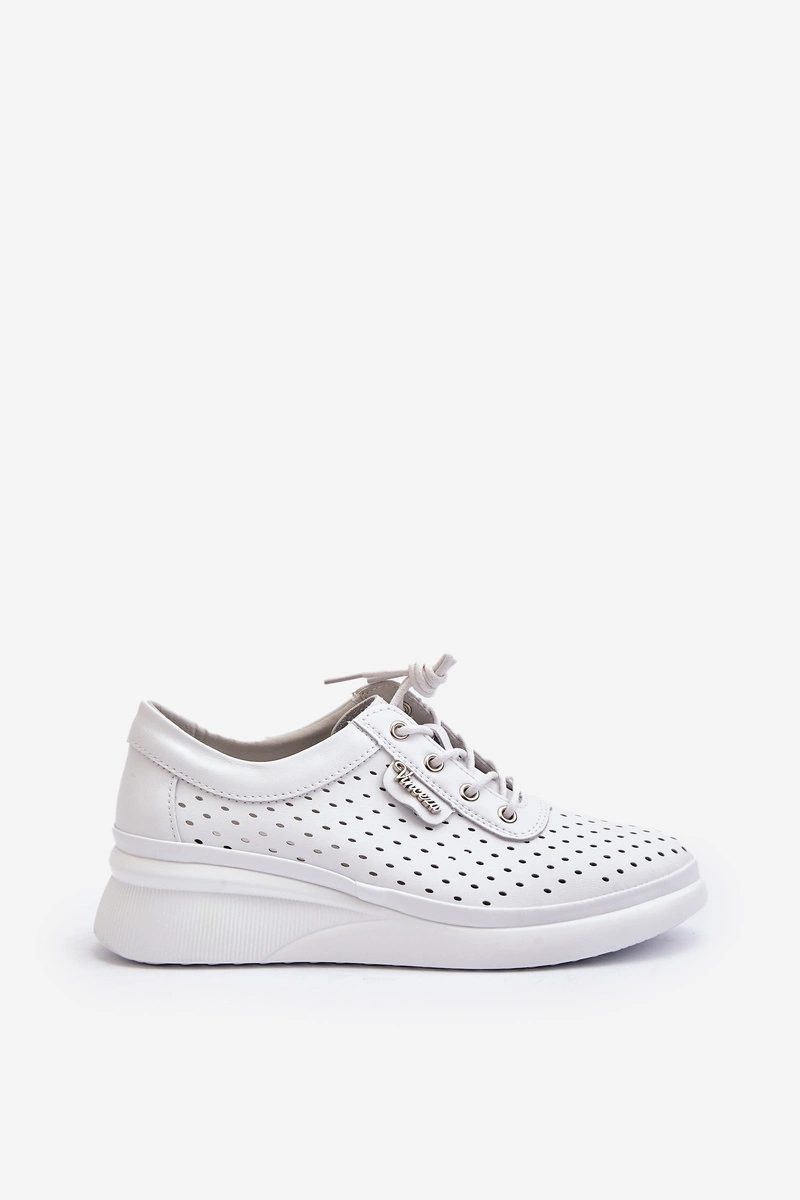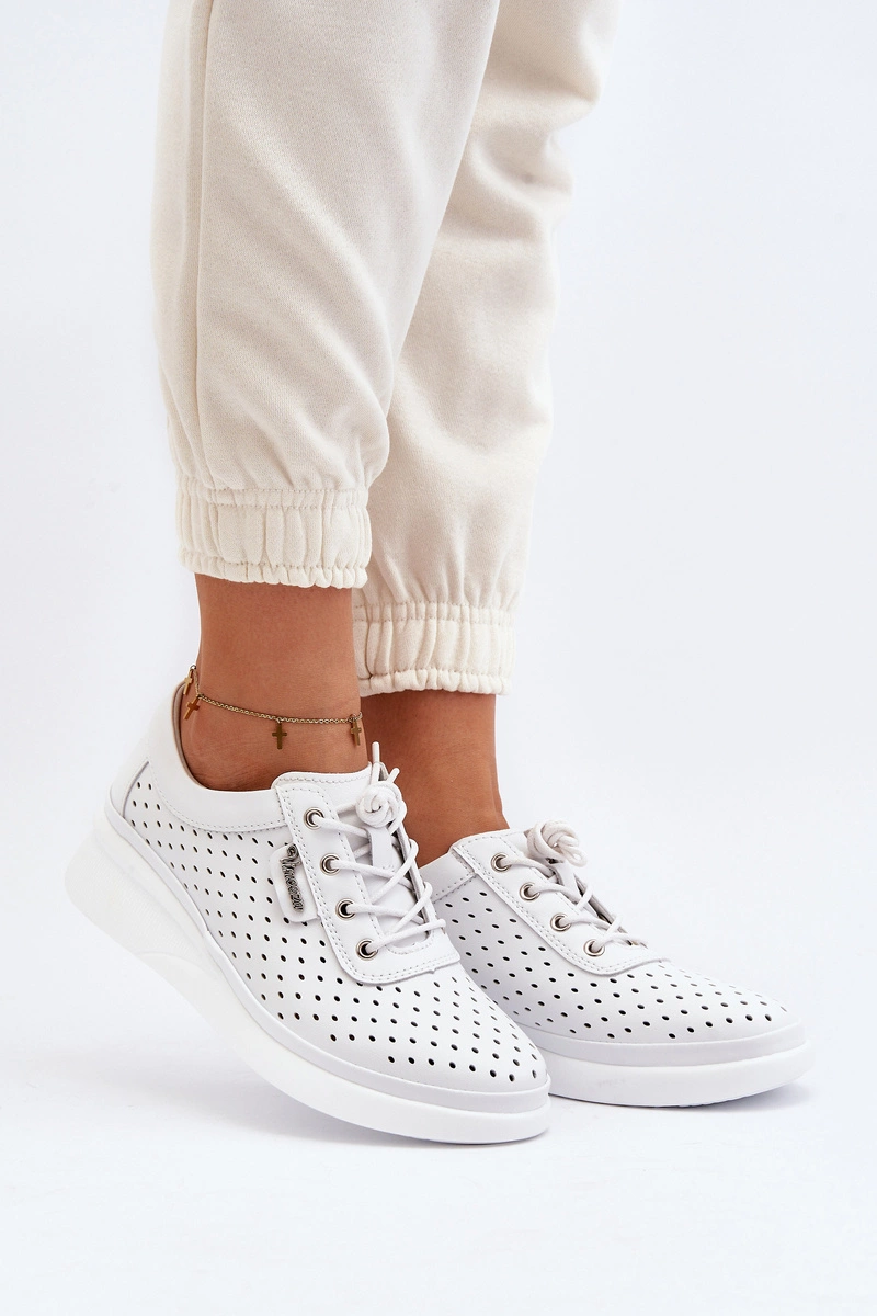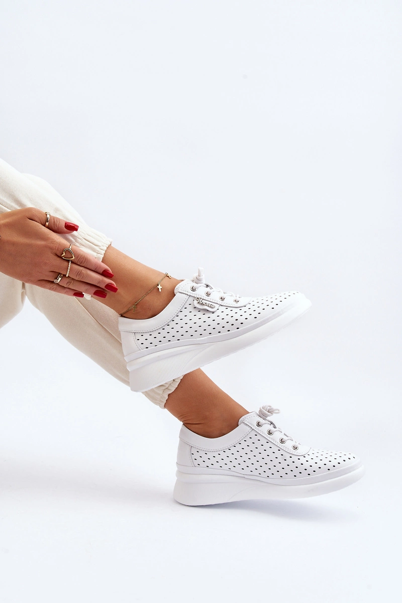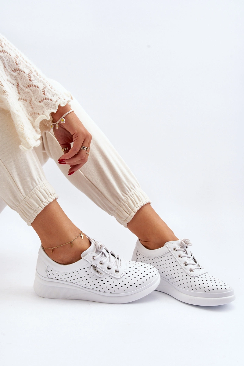 Piękne sneakersy damskie wykonane są z naturalnej skóry, która gwarantuje wysoką jakość i trwałość. Ich perforowana struktura po bokach zapewnia odpowiedni przepływ powietrza, co sprawia, że są one idealne na ciepłe dni. Model jest klasycznie sznurowany, co pozwala na idealne dopasowanie do stopy. Zaokrąglony nosek dodaje butom elegancji. Miękka, skórzana wkładka zapewnia wygodę podczas noszenia. Te modne trampki to doskonały wybór na codzienne stylizacje! Przy wyborze rozmiaru prosimy sugerować się tabelą rozmiarów.