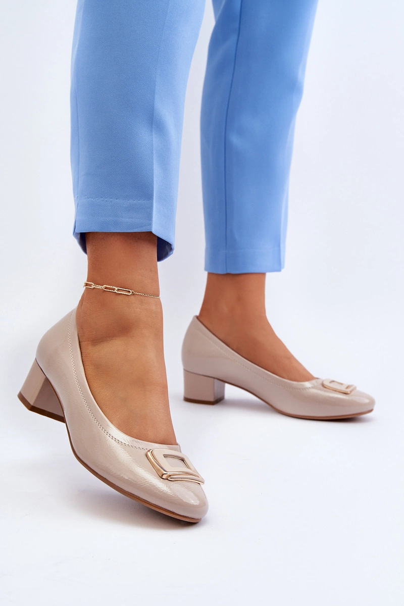 Lakierowane Czółenka Na Klocku Z Ozdobą Beżowe Enollia
