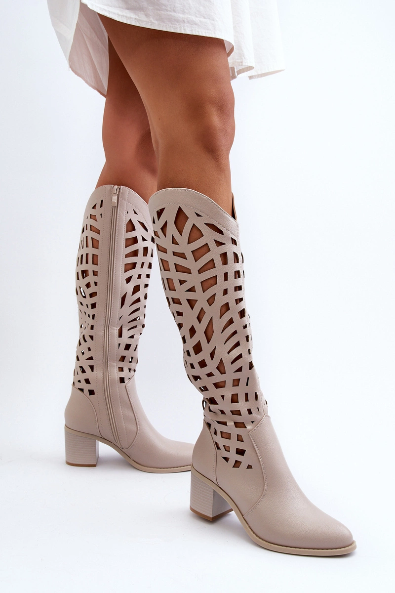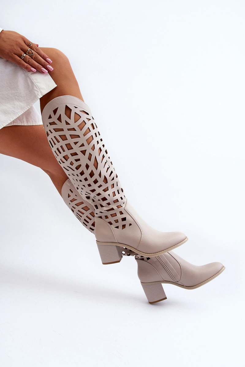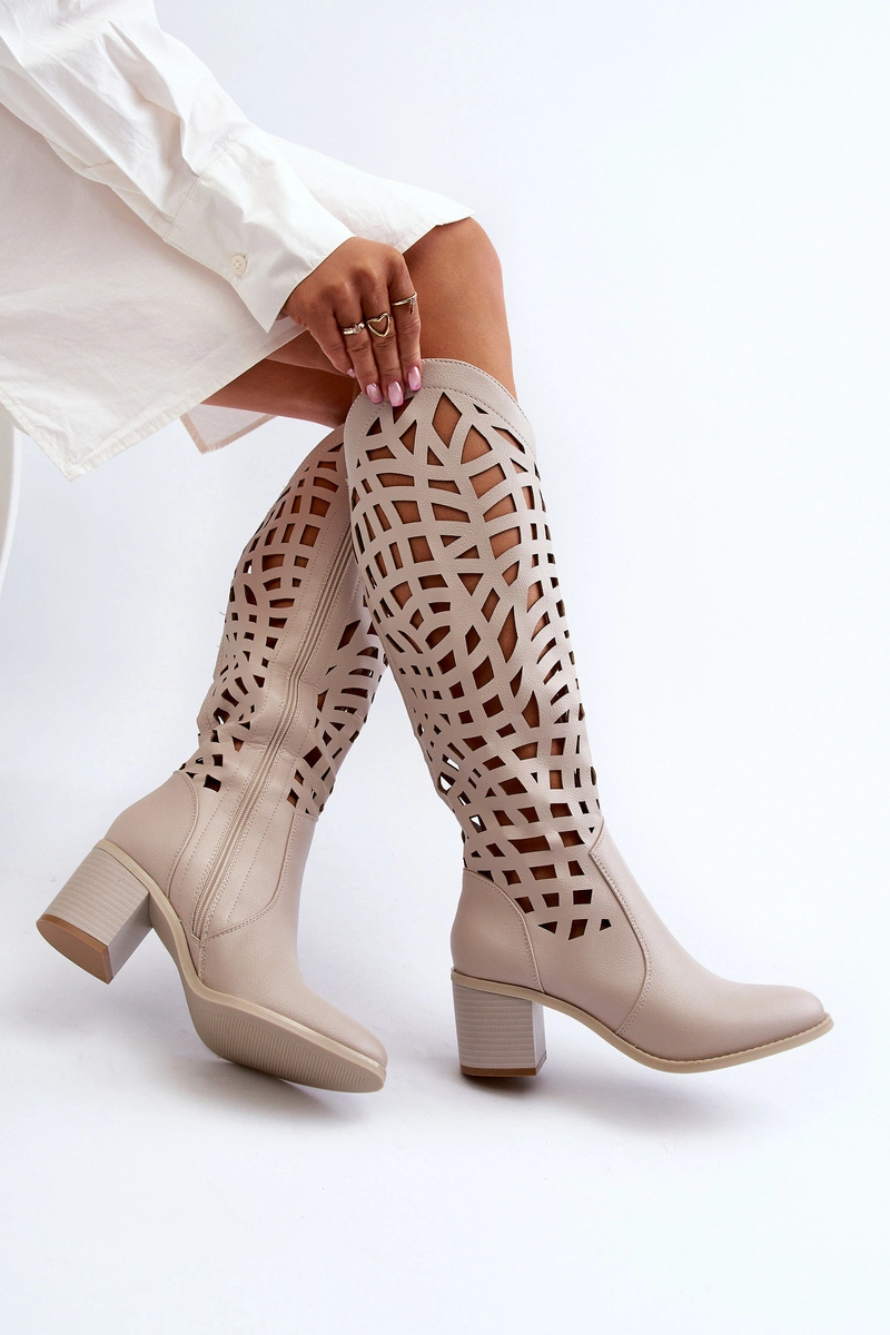 Ażurowe Kozaki Na Obcasie Beżowe Pinkema