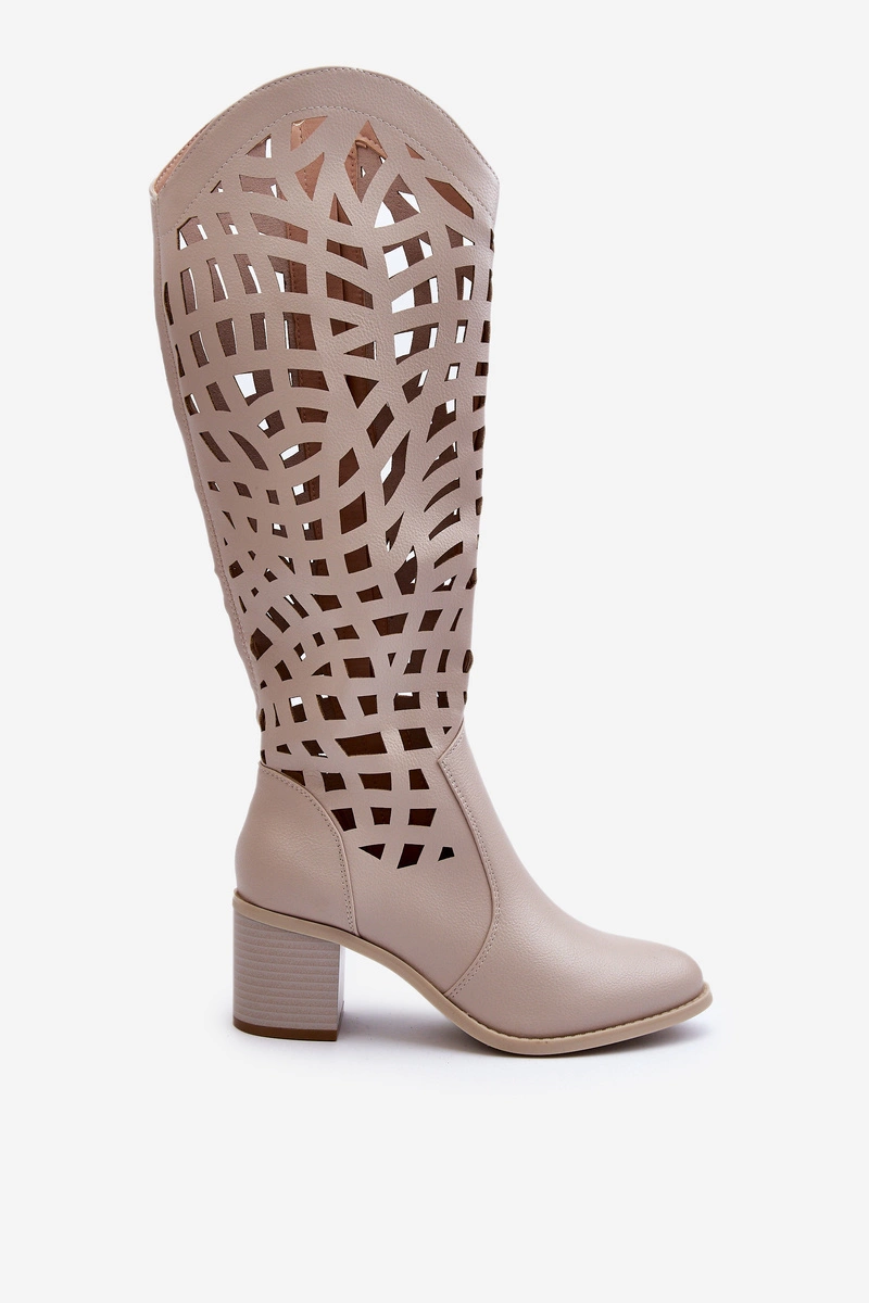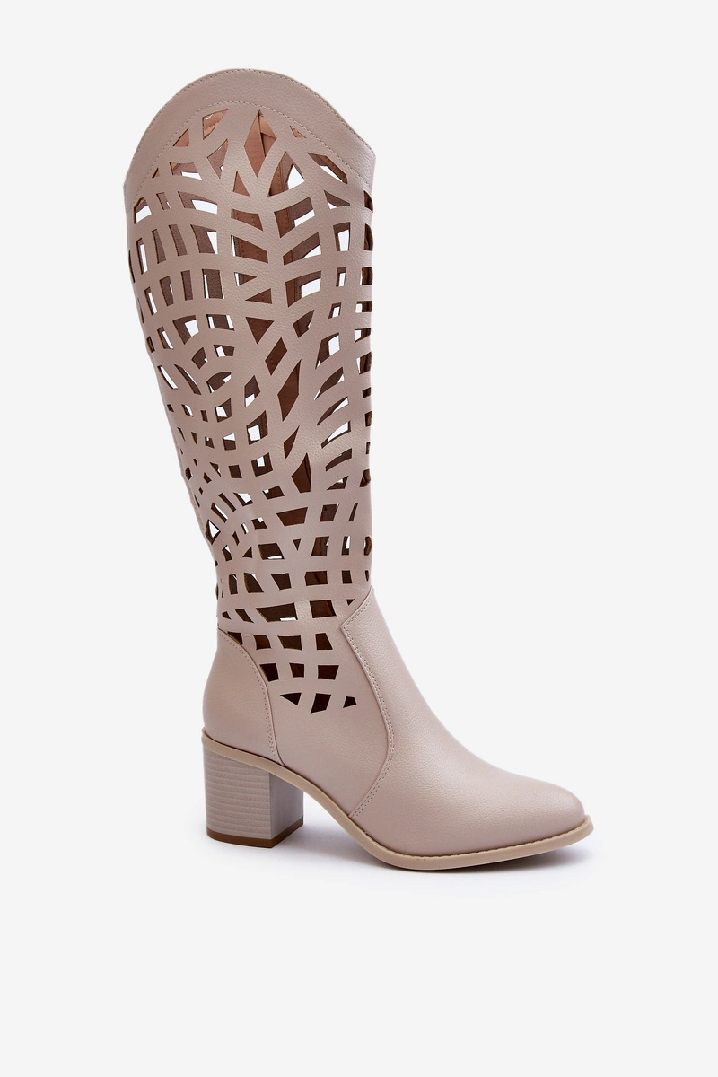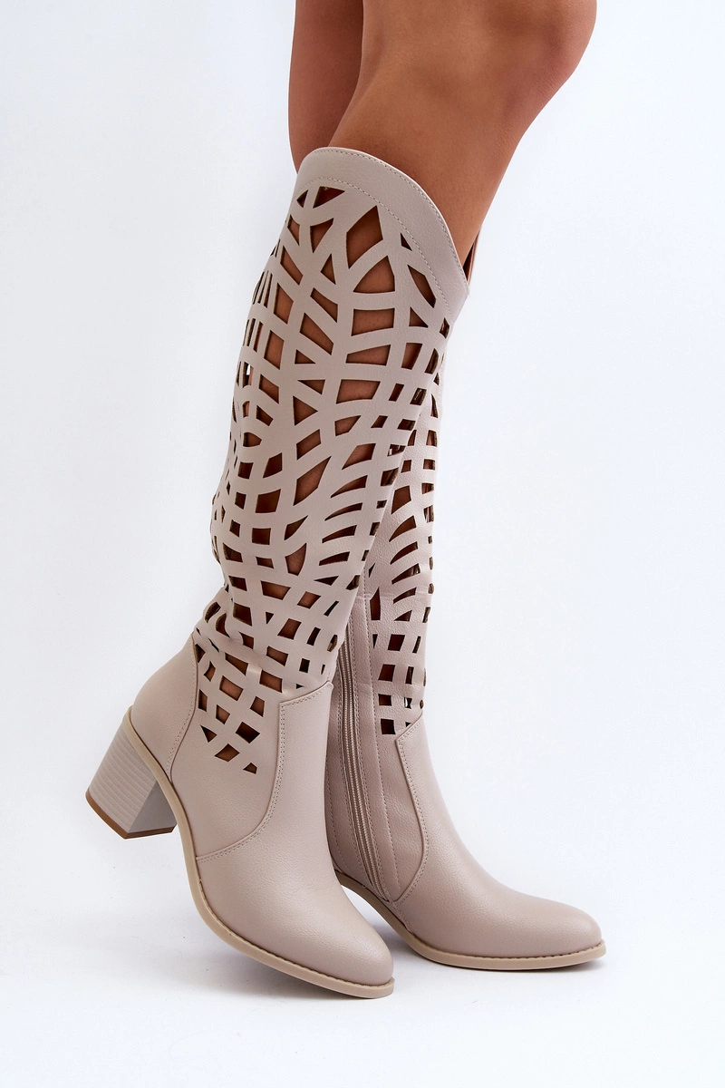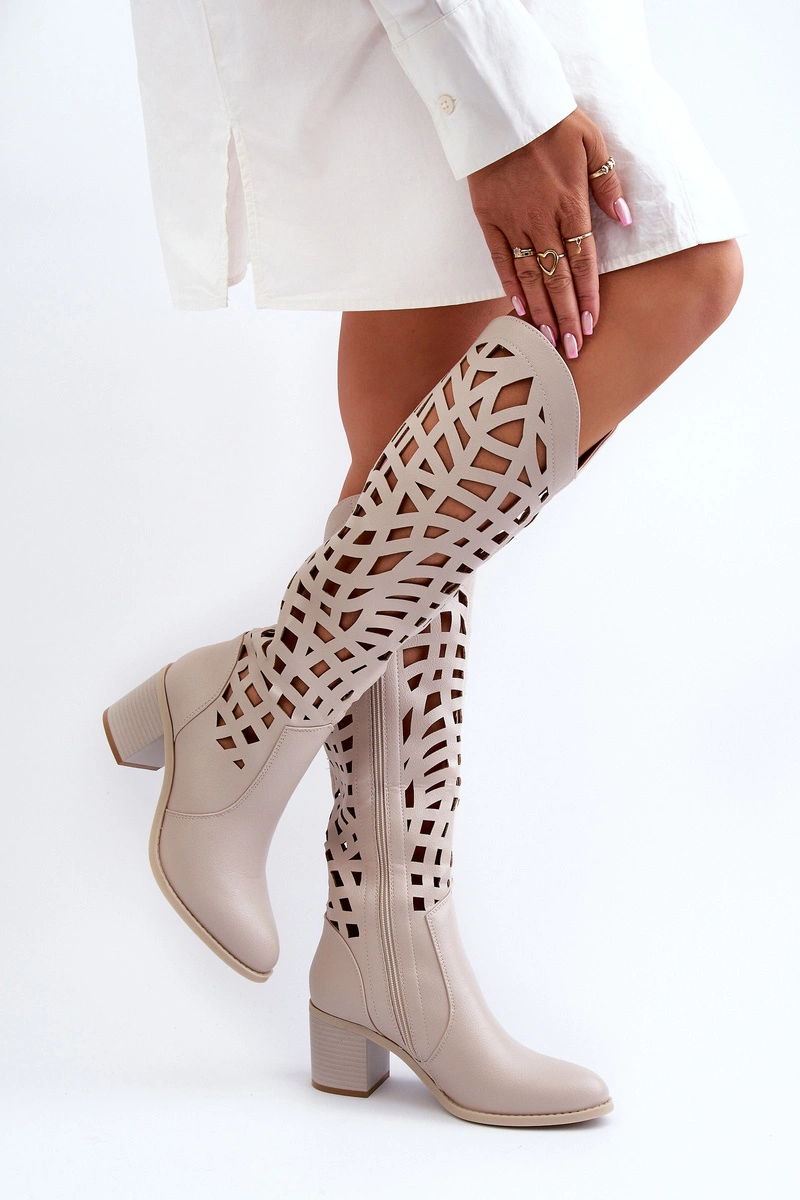 Ażurowe Kozaki Na Obcasie Beżowe Pinkema