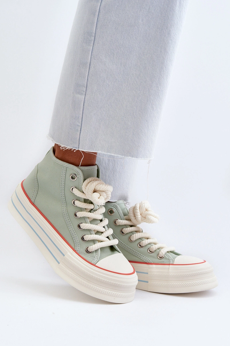 Trampki damskie wykonane z materiału tekstylnego. Masywna platforma z gumowego tworzywa dodaje im modnego wyglądu oraz zapewnia stabilność podczas chodzenia. Zaokrąglone noski oraz klasyczne sznurowanie sprawiają, że są uniwersalnym dodatkiem do wielu casualowych stylizacji. Niezależnie od tego, czy idziesz na spacer po mieście czy spotkanie ze znajomymi, te trampki będą doskonałym wyborem. Przy wyborze rozmiaru prosimy sugerować się tabelą rozmiarów.