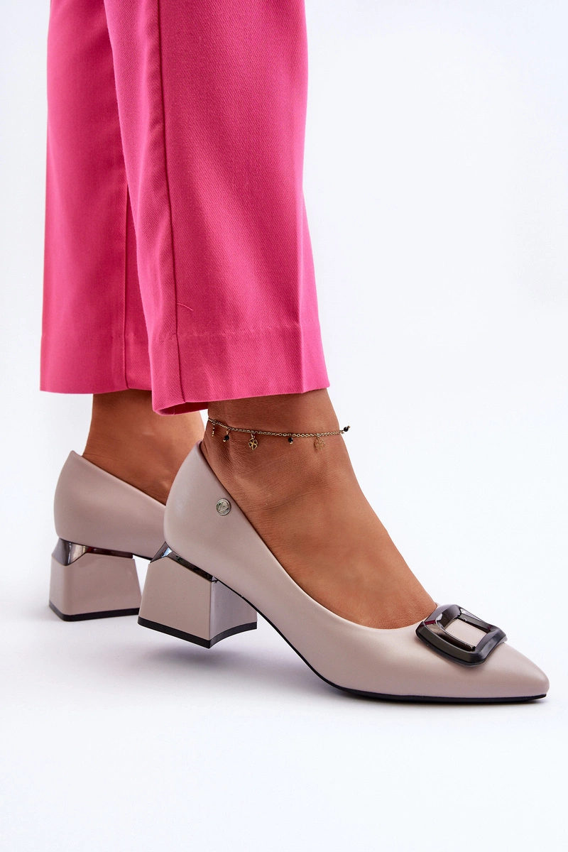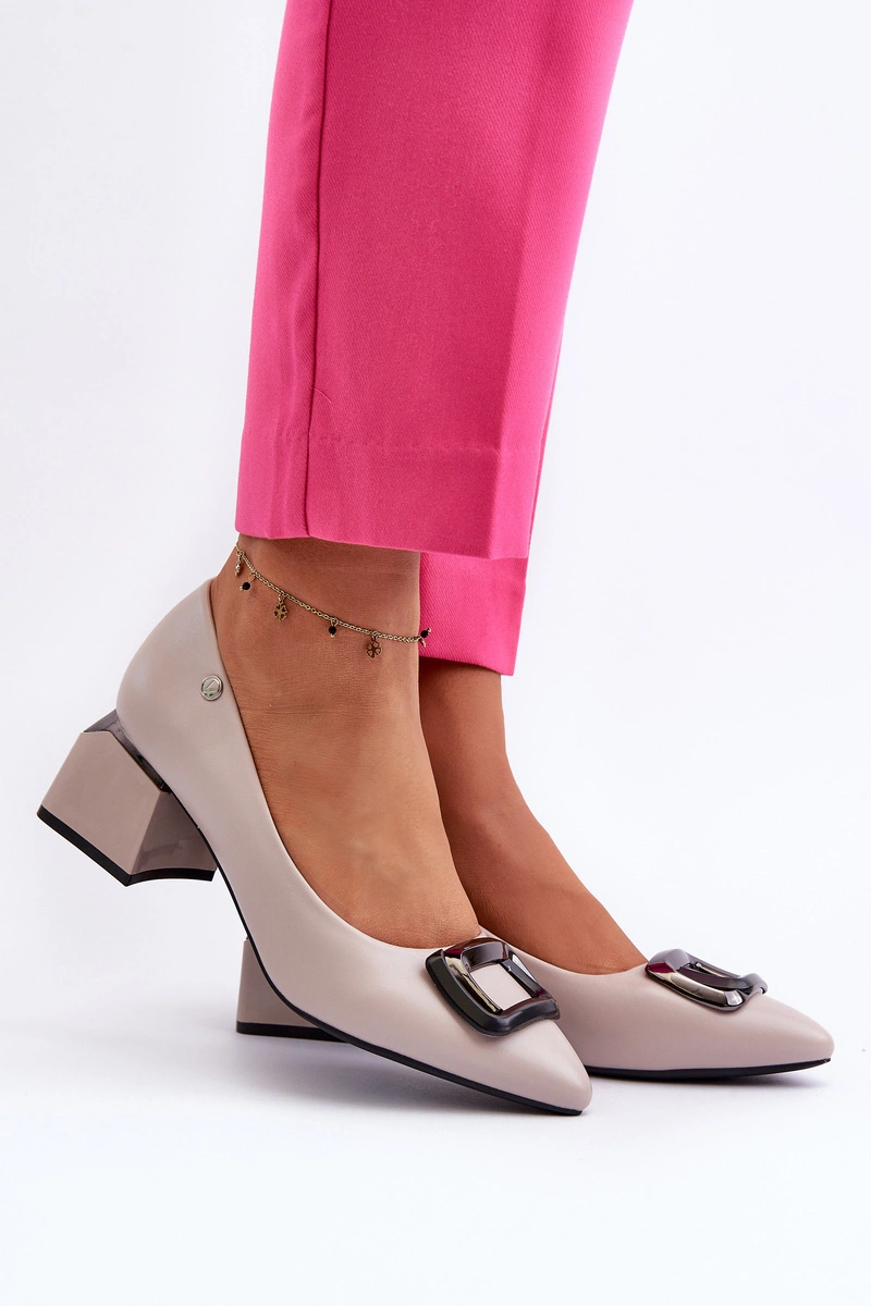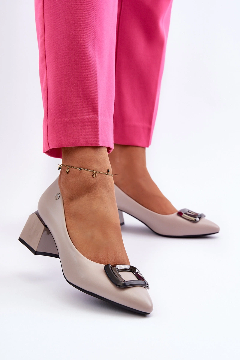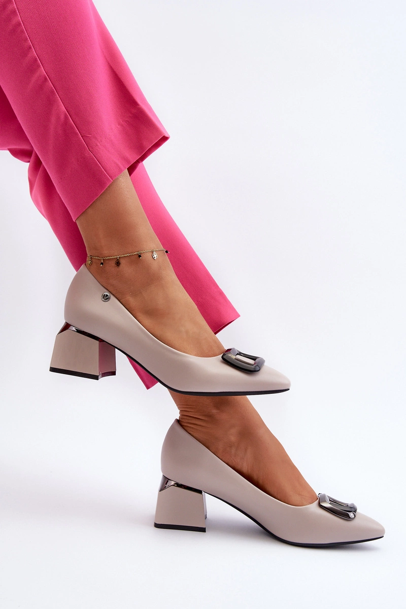 Czółenka Na Obcasie Klocku Z Ozdobą Eko Skórzane Szare Sarala