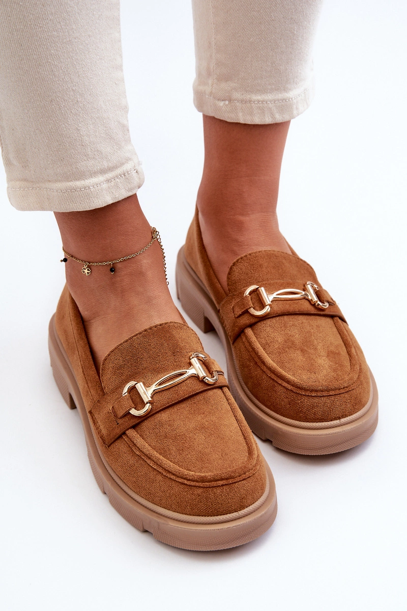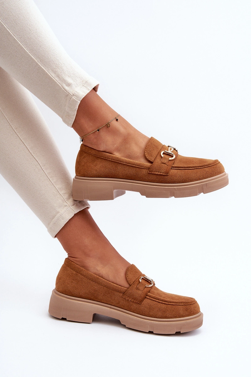 Mokasyny Damskie Ze Złotą Ozdobą Eko Zamszowe Camel Lighas