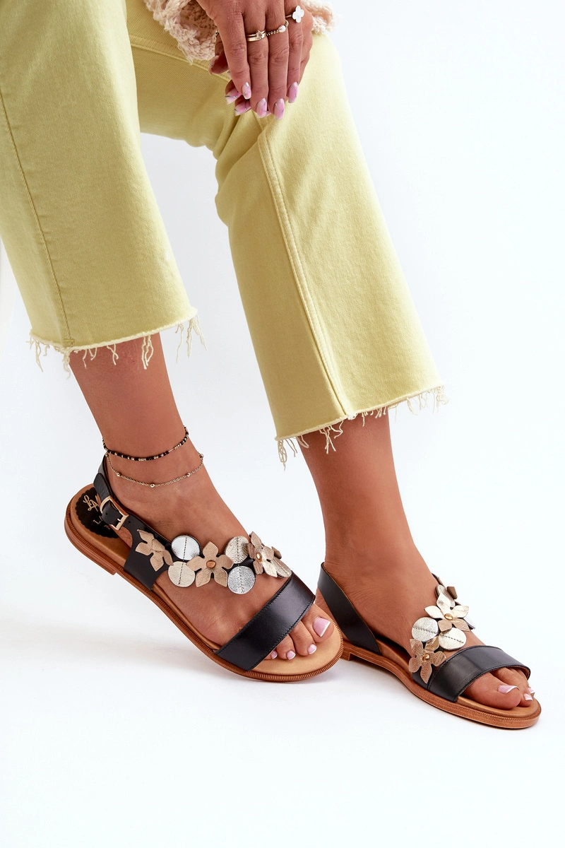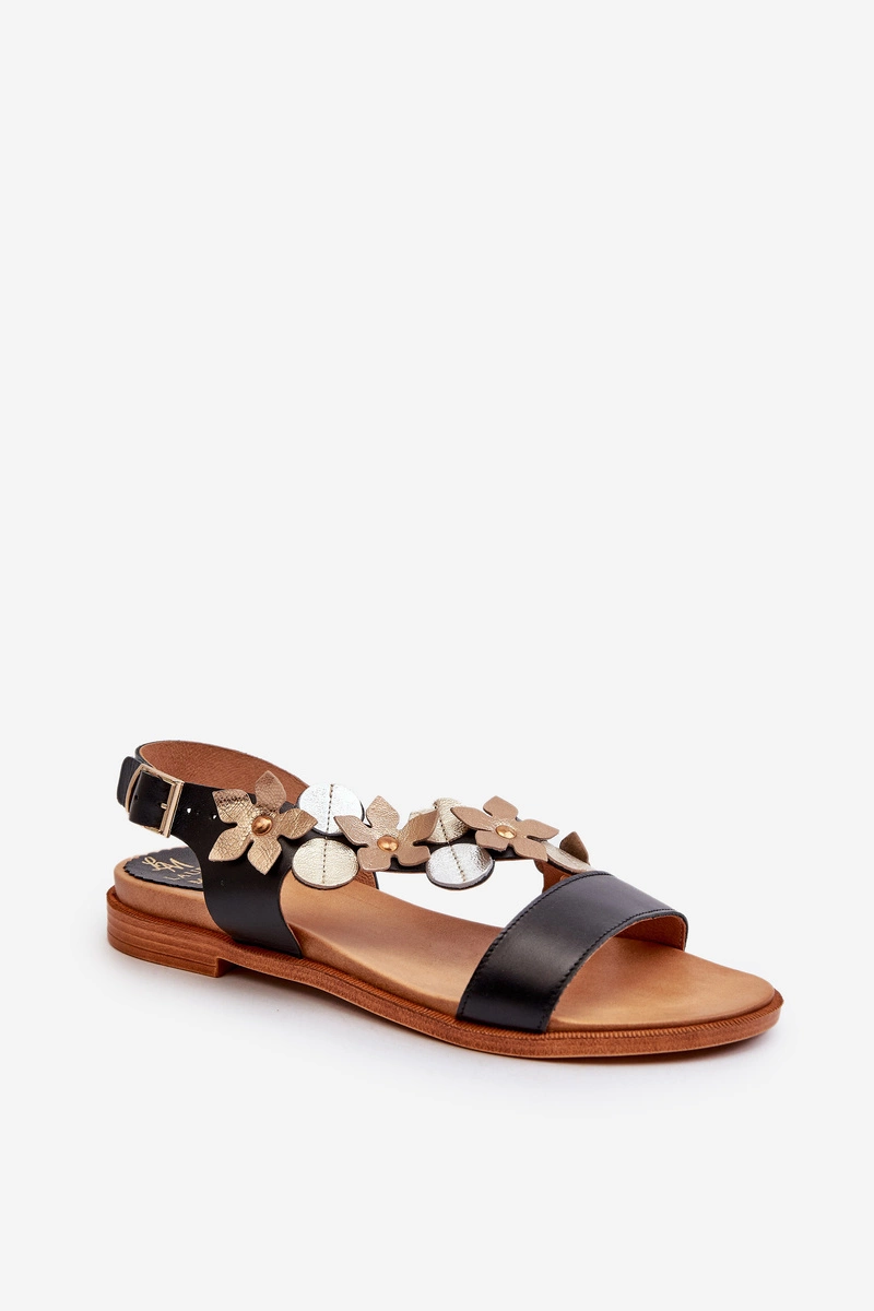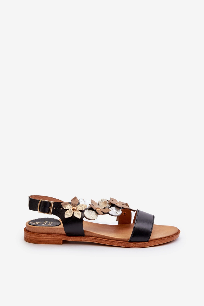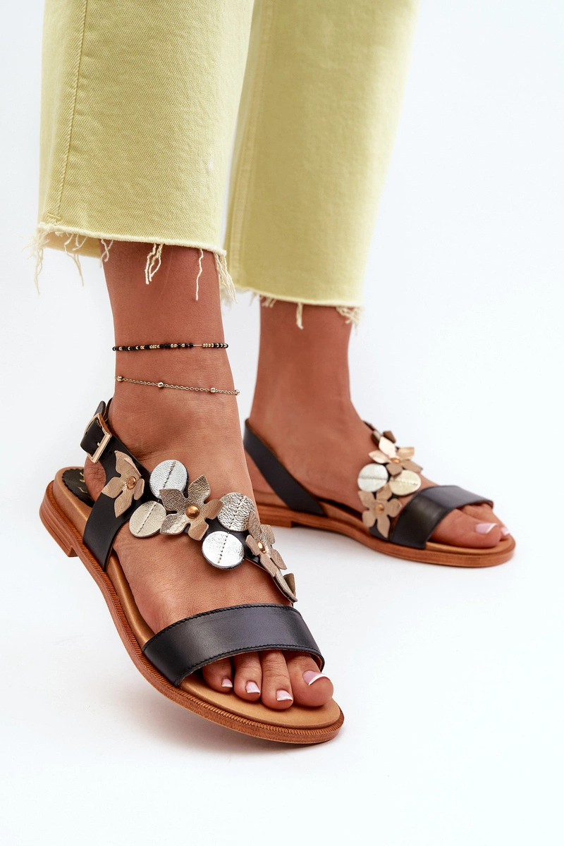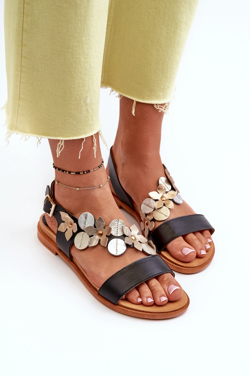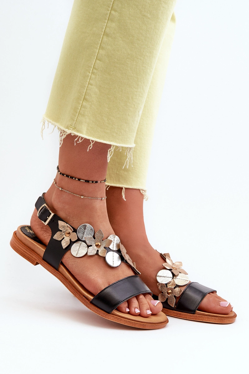 Skórzane Sandały Damskie Ozdobione Kwiatkami Laura Messi 2762 Czarne