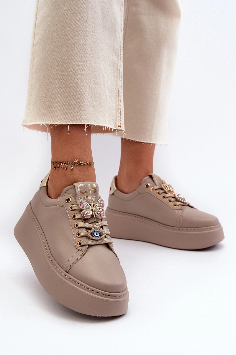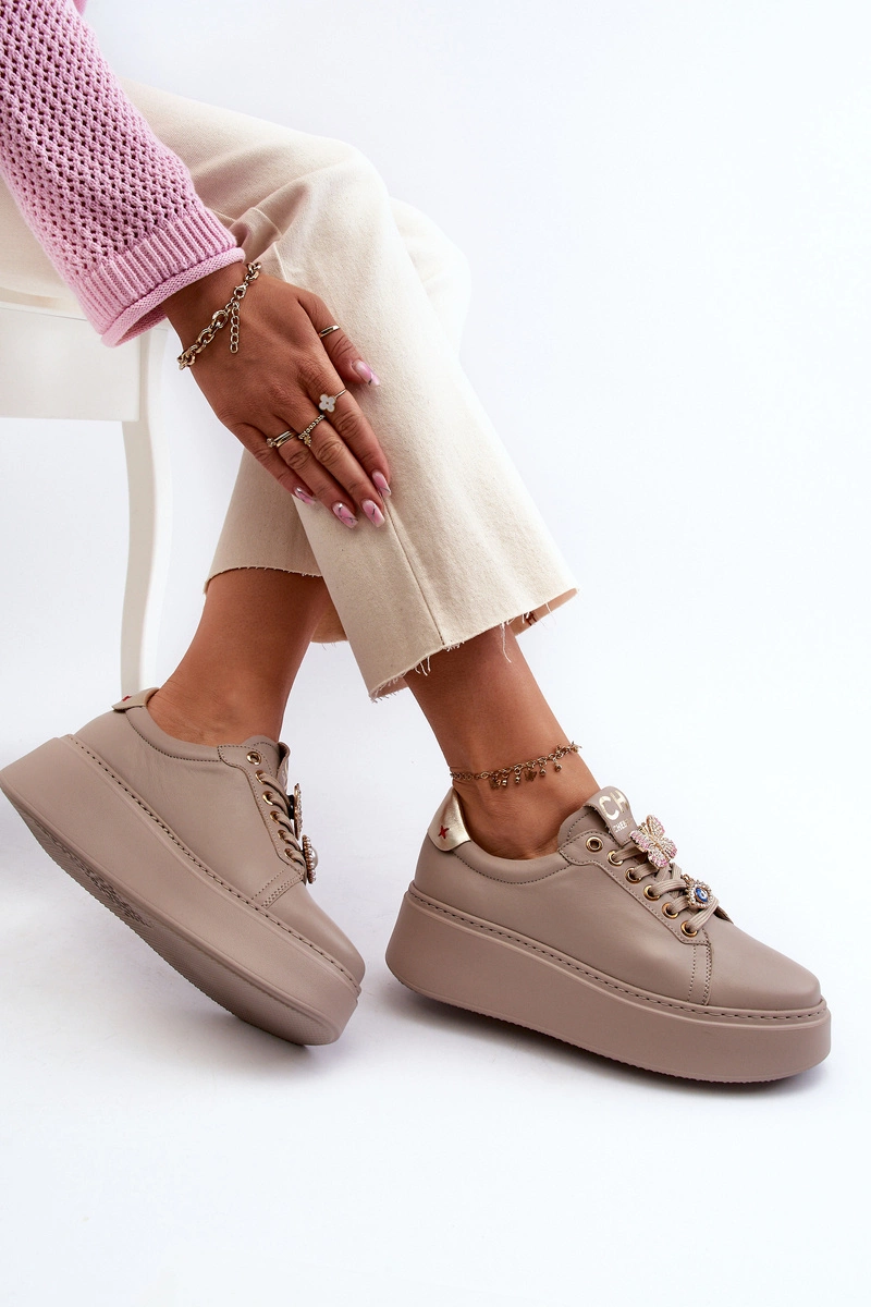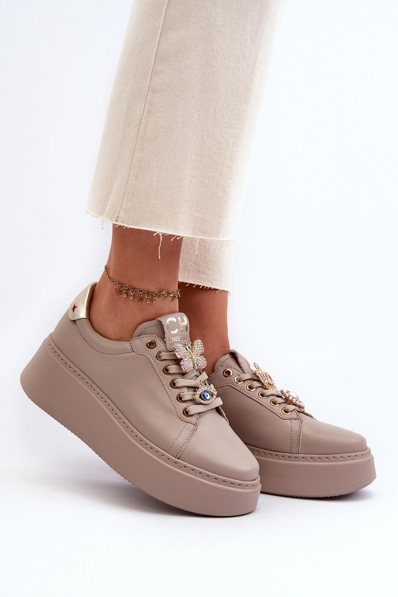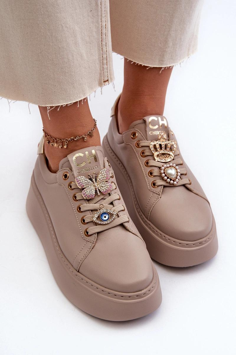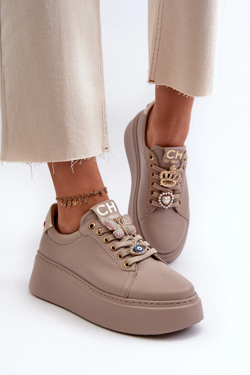 Damskie Skórzane Sneakersy Z Ozdobami CheBello 4292 Beżowe