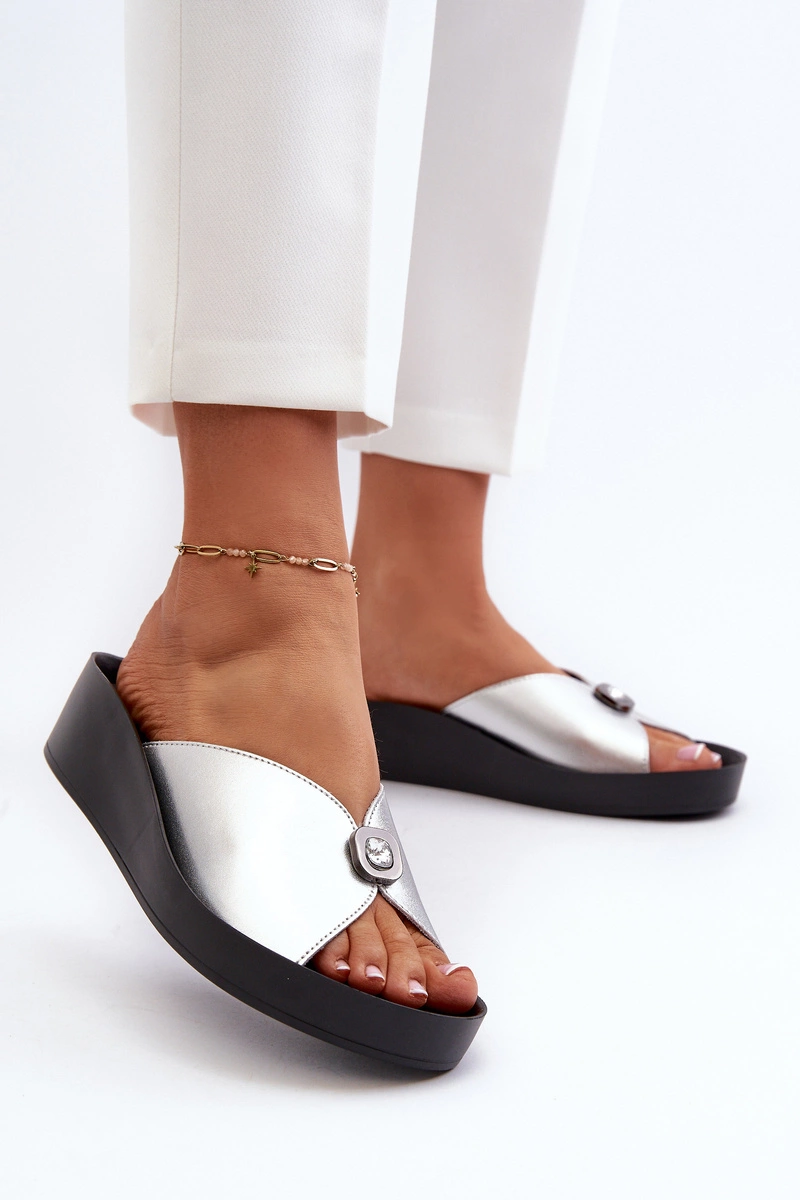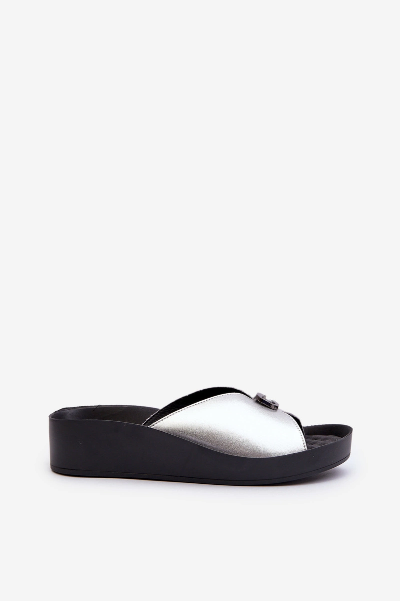 Skórzane Klapki Damskie Z Ozdobą Srebrne S.Barski KV27-027