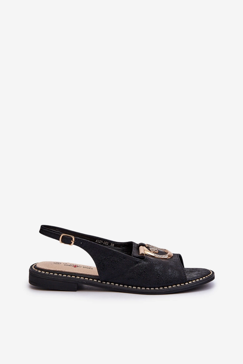 Eleganckie sandały damskie od marki S.Barski wykonane z eko skóry. Osadzone na płaskim obcasie. Złota ozdoba dodaje im subtelnego uroku. Skórzana wkładka comfort zapewni wygodę podczas użytkowania. Zapinane na regulowany pasek ze sprzączką. Doskonałe na wiele różnych okazji! Przy wyborze rozmiaru prosimy kierować się tabelą rozmiarów.