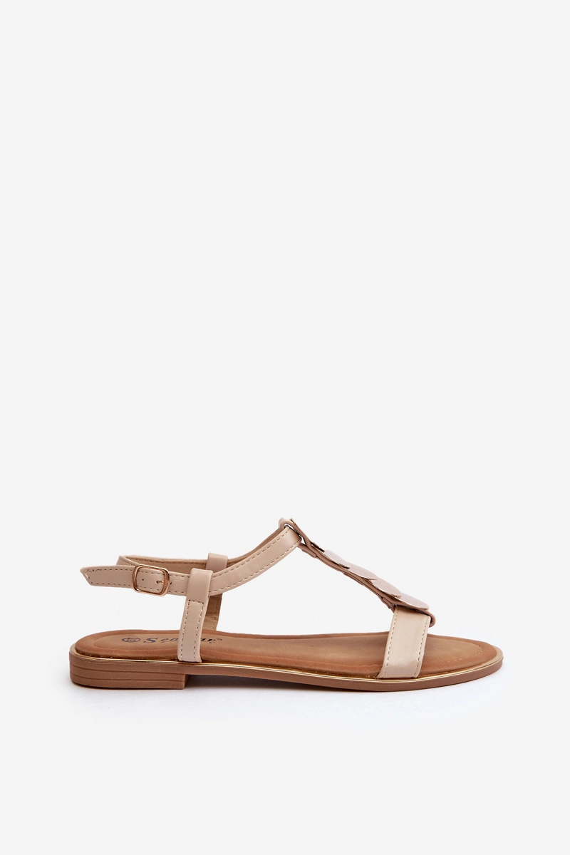 Płaskie sandały damskie wykonane z eko skóry. Ozdobione złotymi detalami. Zapinane na regulowany pasek ze sprzączką dla idealnego dopasowania. Model ten z pewnością dopasujesz do wielu stylizacji! Przy wyborze rozmiaru prosimy sugerować się tabelą rozmiarów.