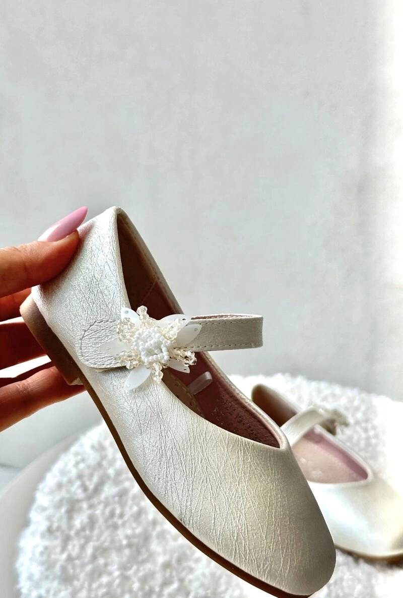 Brokatowe Balerinki Dziecięce Zapinane Na Rzep Beżowe Jeylin