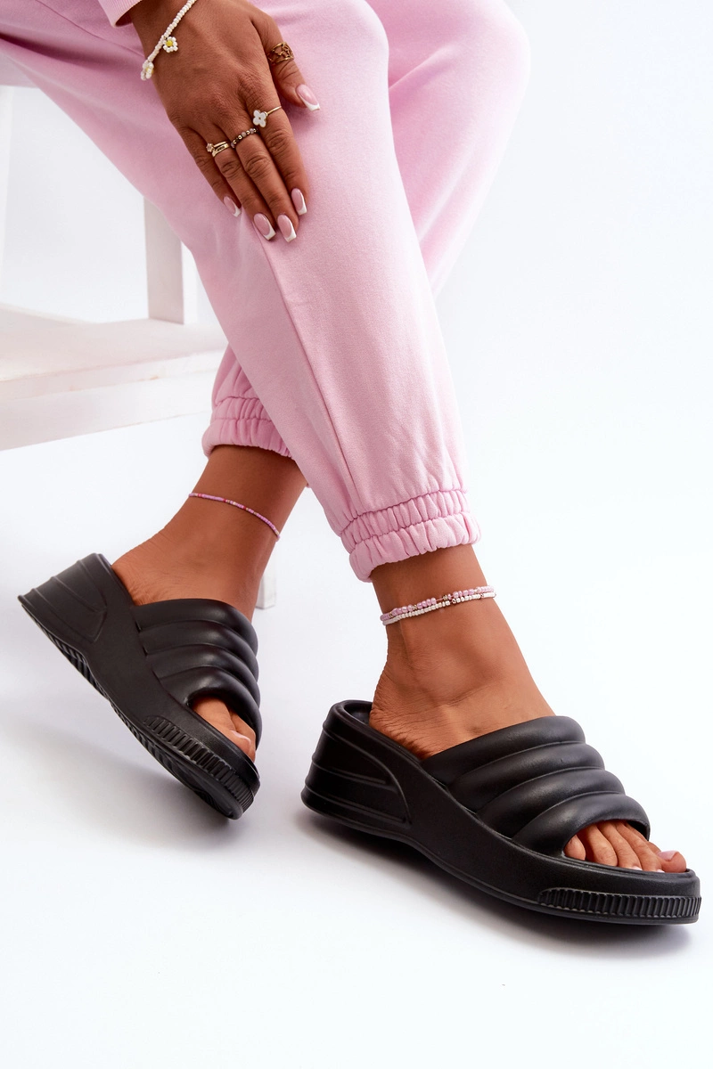 Klapki damskie wykonane z piankowego tworzywa. Osadzone na platformie i koturnie. Lekki model, który idealnie sprawdzi się na dni spędzone przy basenie! Przy wyborze rozmiaru prosimy kierować się tabelą rozmiarów.