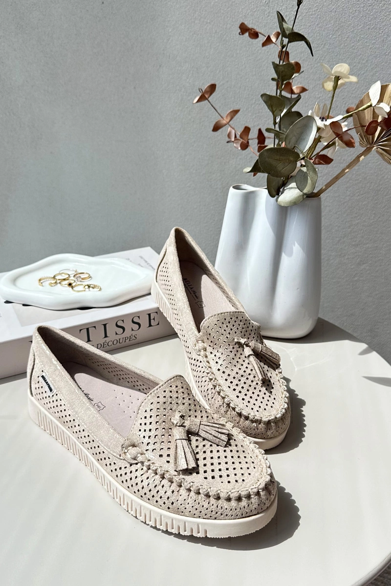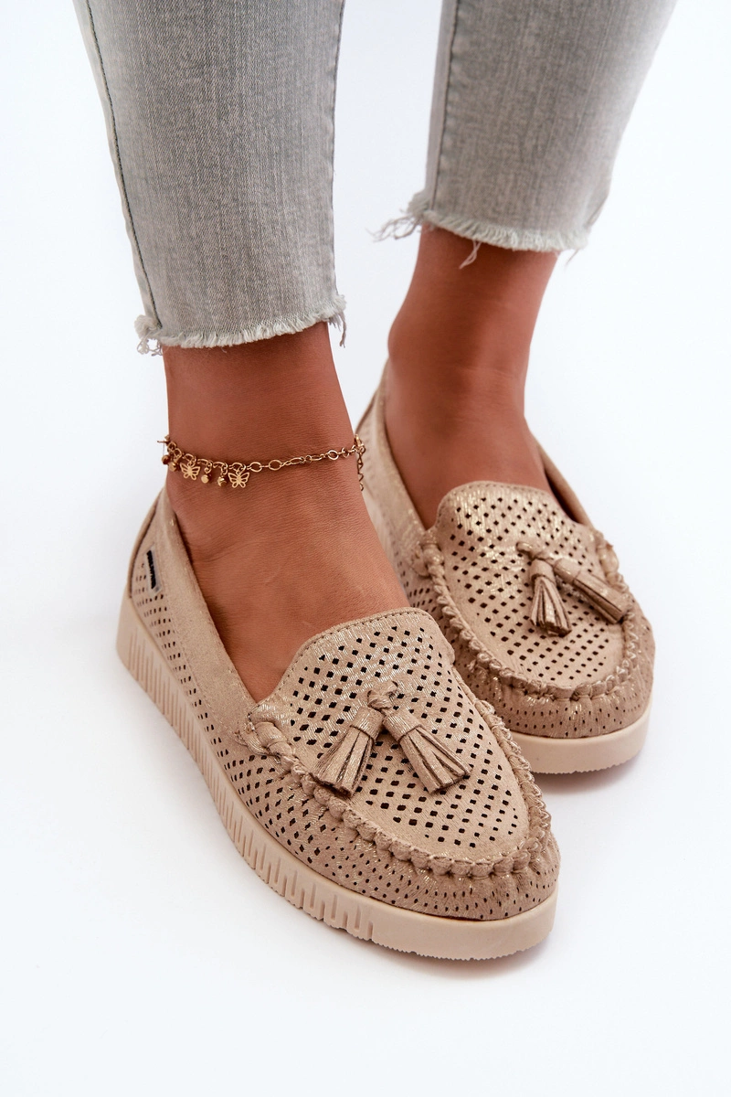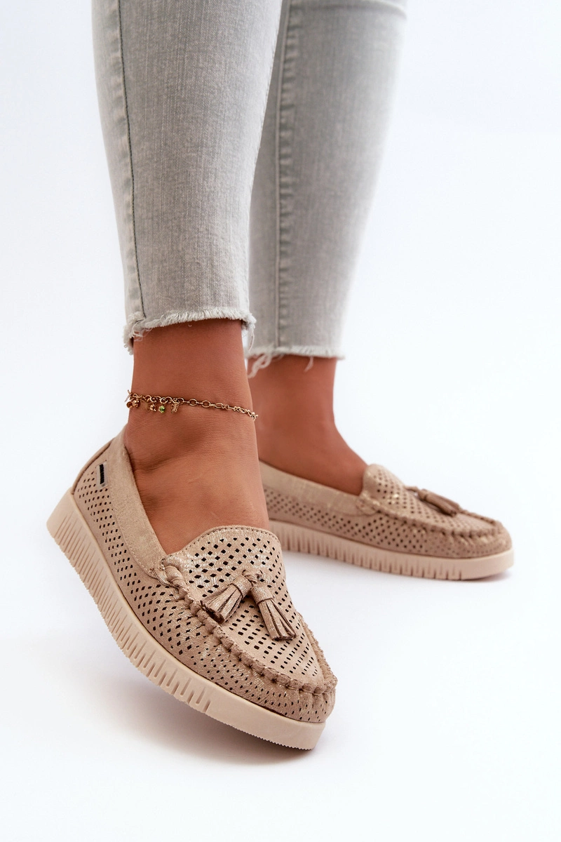 Mokasyny damskie wykonane z eko zamszu. Osadzone na platformie. Noski zaokrąglone. Przód ozdobiony małymi frędzlami. Model ten posiada miękką wkładkę ze skóry naturalnej, która zapewni wygodę podczas noszenia. Klasyczny fason, który dopasujesz do casualowych oraz eleganckich stylizacji. Przy wyborze rozmiaru prosimy sugerować się tabelą rozmiarów.