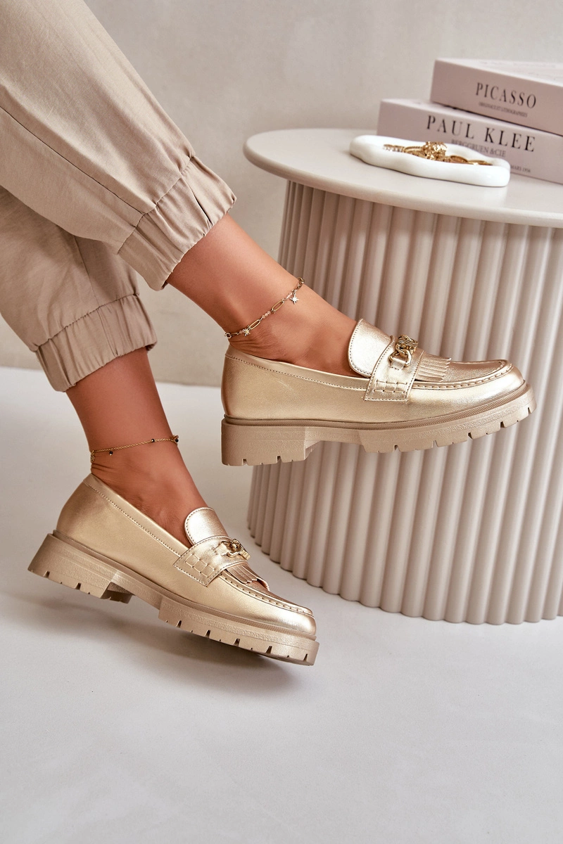 Mokasyny damskie w eleganckim stylu idealne na sezon wiosenno-jesienny. Wykonane ze skóry ekologicznej. Noski zaokrąglone. Przód zdobi złoty detal, który dodaje uroku. Osadzone na płaskim, stabilnym obcasie. Niezwykle modny fason idealnie dopełni wiele styliacji! Przy wyborze rozmiaru prosimy sugerować się tabelą rozmiarów.