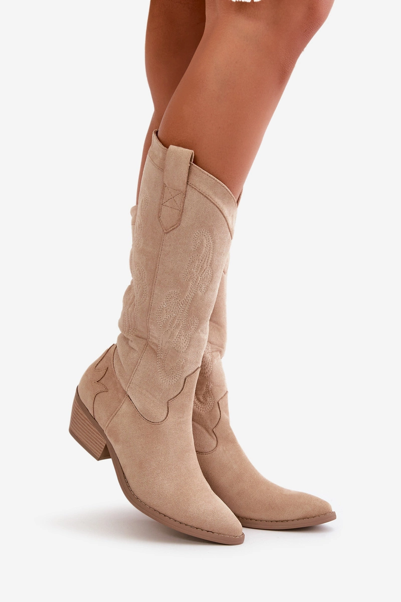 Damskie Kozaki Kowbojki Na Niskim Obcasie Z Eko Zamszu Beżowe Ligelia