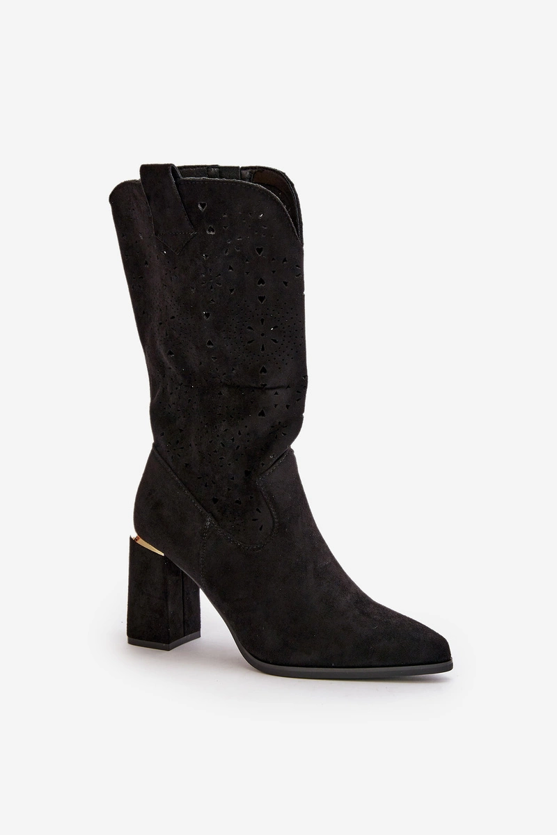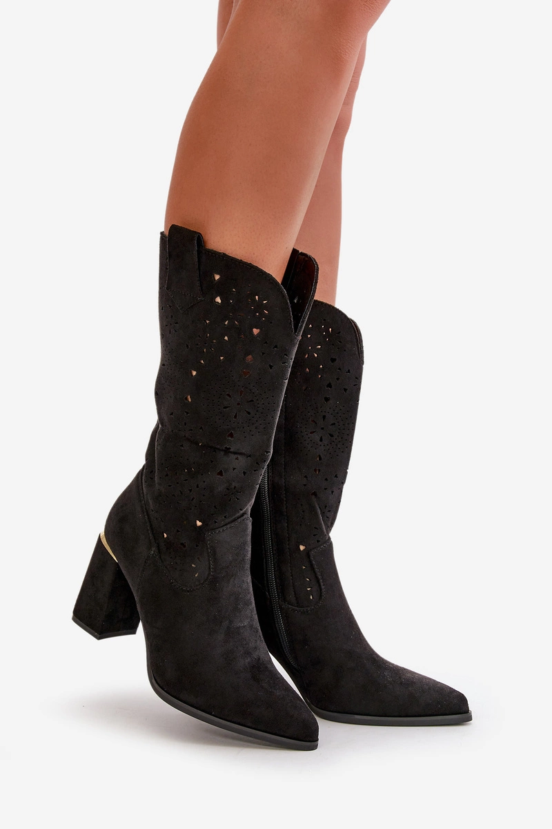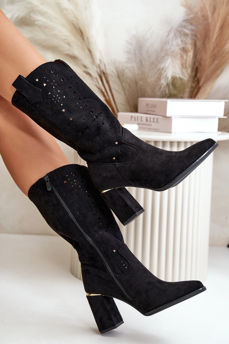 Damskie botki z przyjemnego w dotyku eko zamszu. Posiadają ażurową cholewkę sięgającą do połowy łydki. Osadzone na słupkowym obcasie z lustrzanym akcentem. Zapinane na zamek, z noskami w szpic. Ten modny i elegancki fason będzie idealnym dopełnieniem wielu stylizacji! Przy wyborze rozmiaru prosimy sugerować się tabelą rozmiarów.
