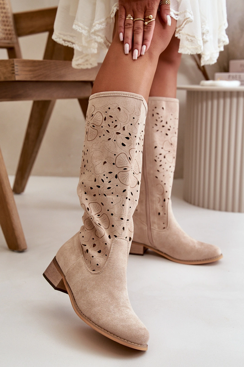 Kozaki damskie wykonane z wysokiej jakości eko zamszu. Cholewka sięga przed kolano, a jej ażurowy wzór dodaje wyjątkowego charakteru. Zapinane na zamek, co ułatwia zakładanie i zdejmowanie. Osadzone na niskim obcasie, który gwarantuje komfort noszenia przez cały dzień. Noski są zaokrąglone. Usztywniony zapiętek zapewnia dodatkowe wsparcie i stabilność. Te kozaki doskonale sprawdzą się zarówno w casualowych, jak i bardziej eleganckich stylizacjach. Przy wyborze rozmiaru prosimy kierować tabelą rozmiarów.