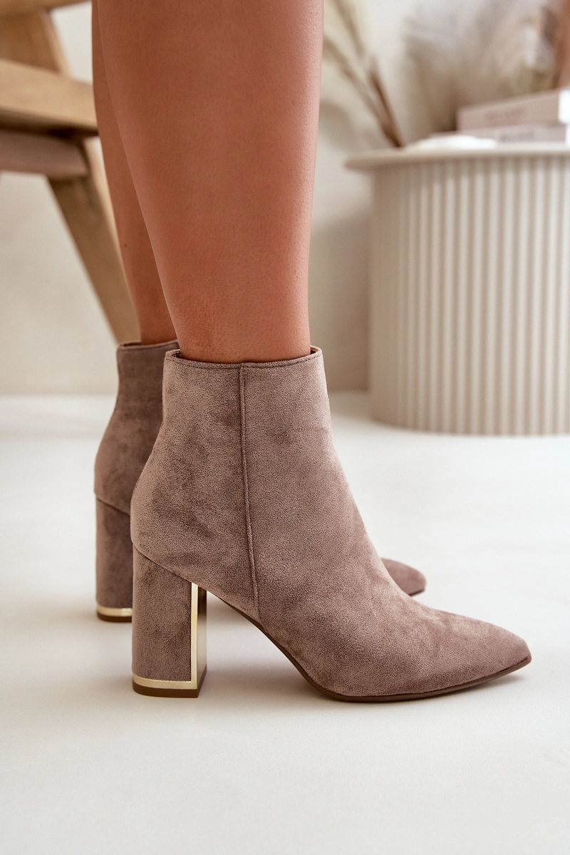 Damskie botki wykonane z eko zamszu, który jest przyjemny w dotyku i dodaje im eleganckiego wyglądu. Wnętrze botków jest ocieplane, co zapewnia ciepło i komfort w chłodniejsze dni. Noski w szpic nadają im stylowego charakteru, a obcas w formie stabilnego słupka jest dodatkowo ozdobiony lustrzanym elementem, co dodaje botkom wyjątkowego blasku i modnego akcentu. Koniecznie powinnaś je mieć w swojej jesienno-zimowej garderobie! Przy wyborze rozmiaru prosimy sugerować się tabelą rozmiarów.
