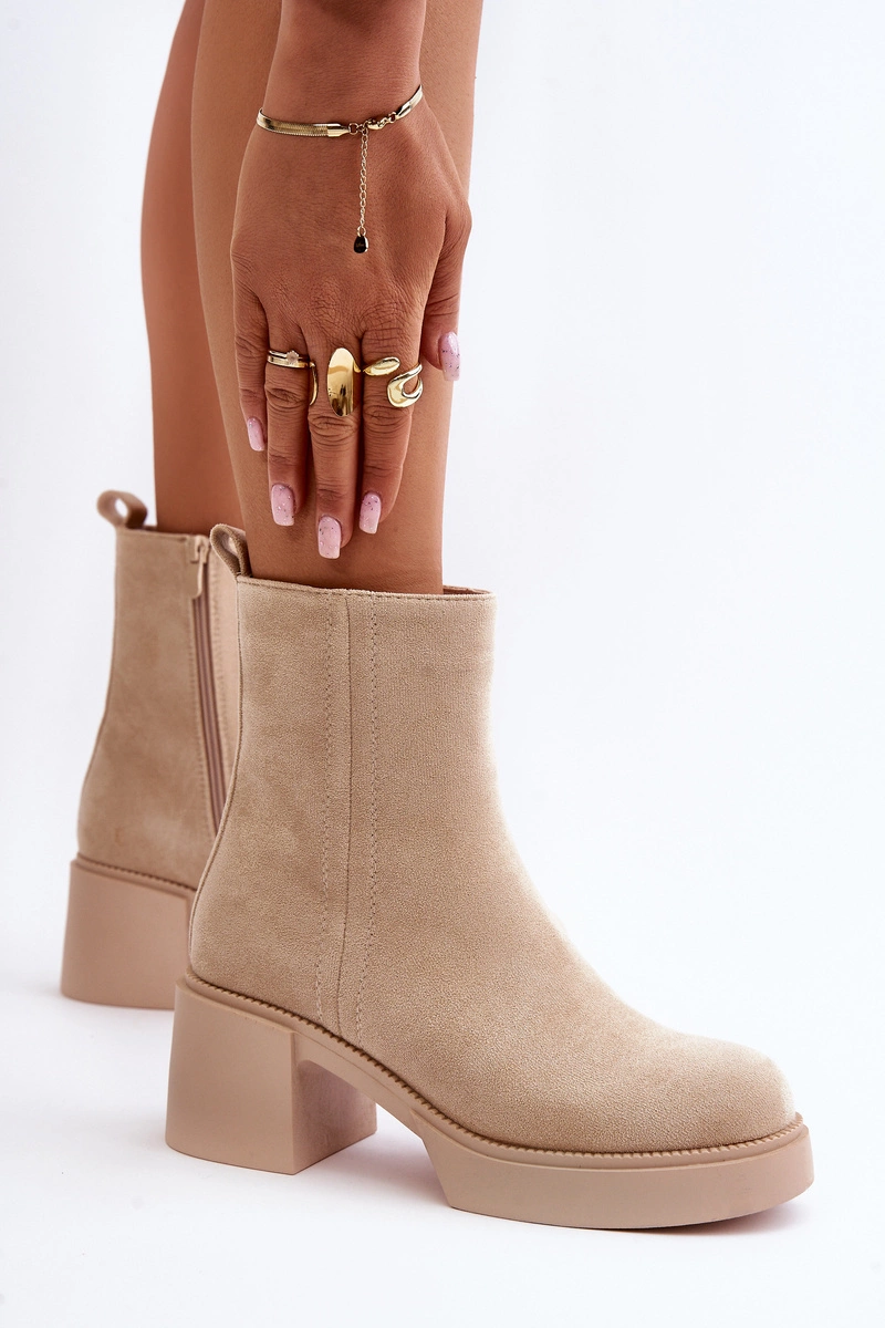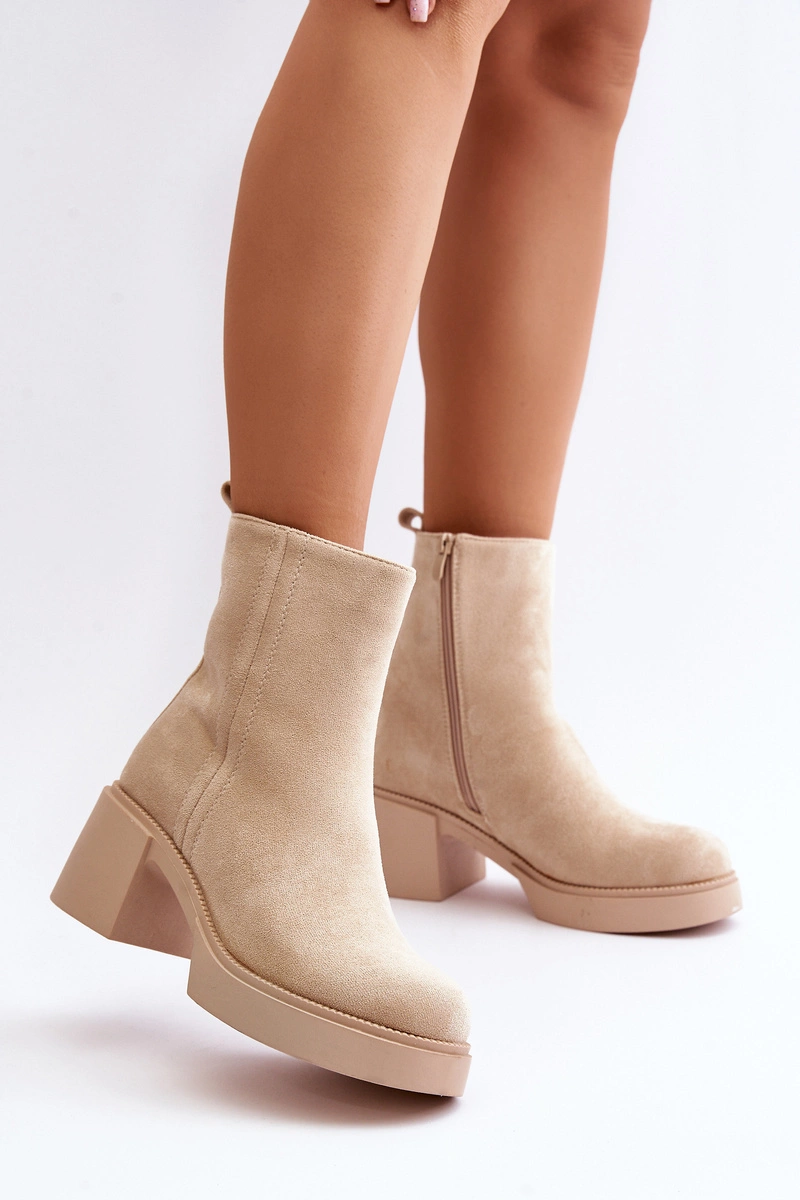Eko Zamszowe Damskie Botki Na Słupku Ocieplane Jasnobeżowe Meriluna II-gat