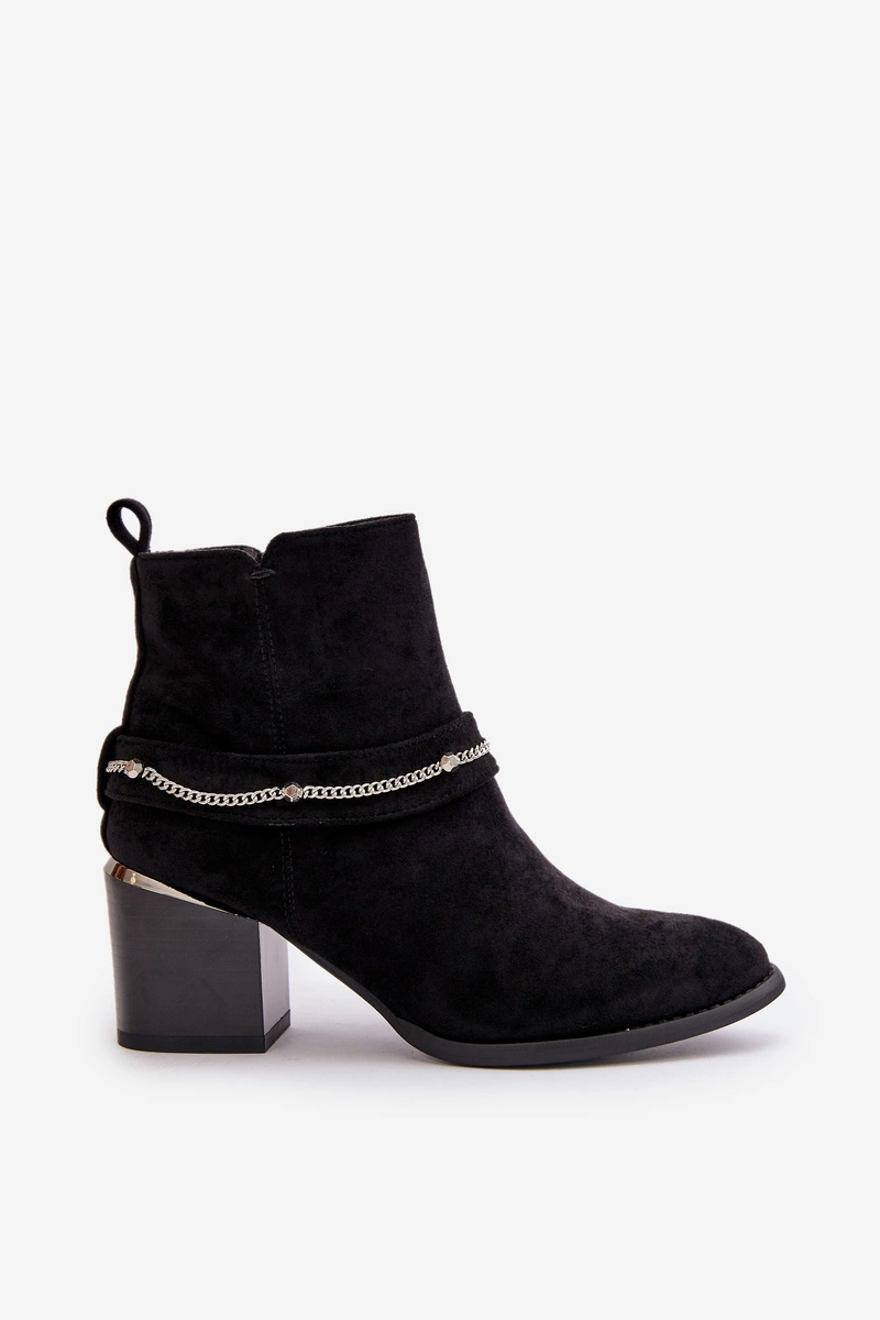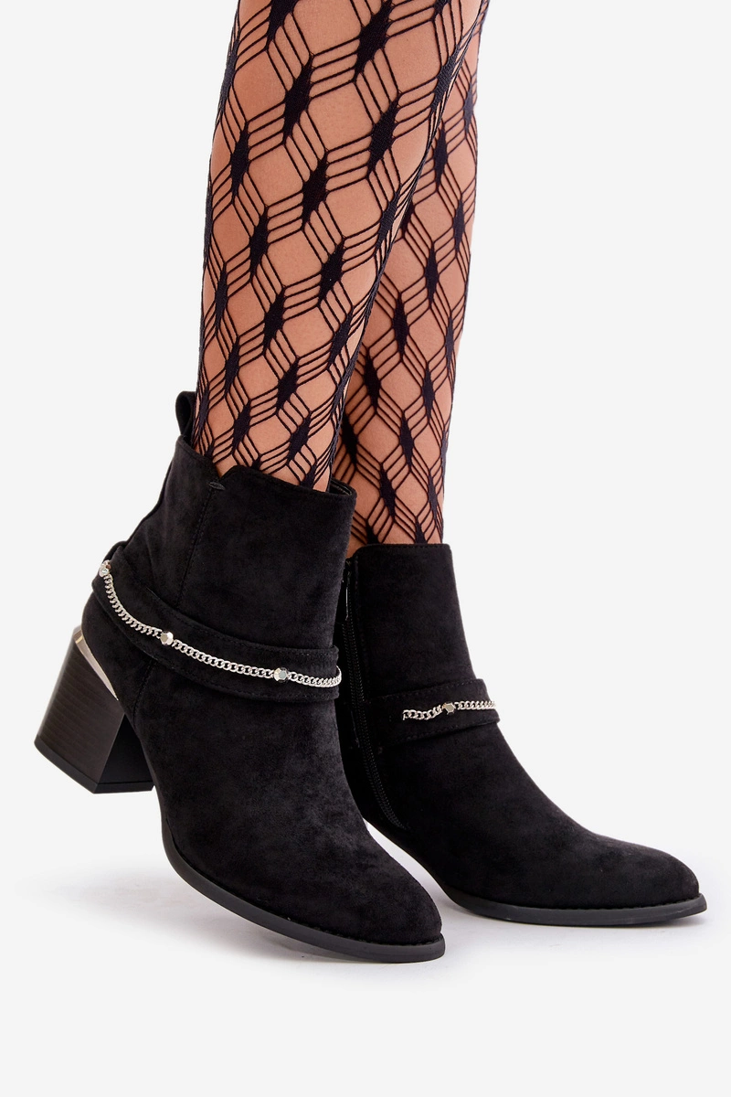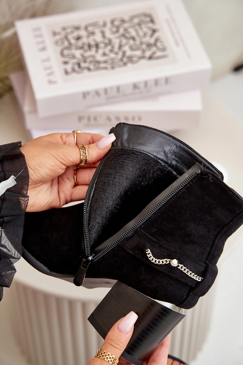 Ocieplane Botki Damskie Na Słupku Z Łańcuszkiem Eko Zamszowe Czarne Hanalen