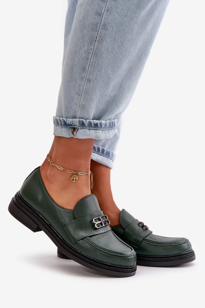 Zazoo 20174 Skórzane Eleganckie Półbuty Damskie Na Płaskim Obcasie Ciemnozielone