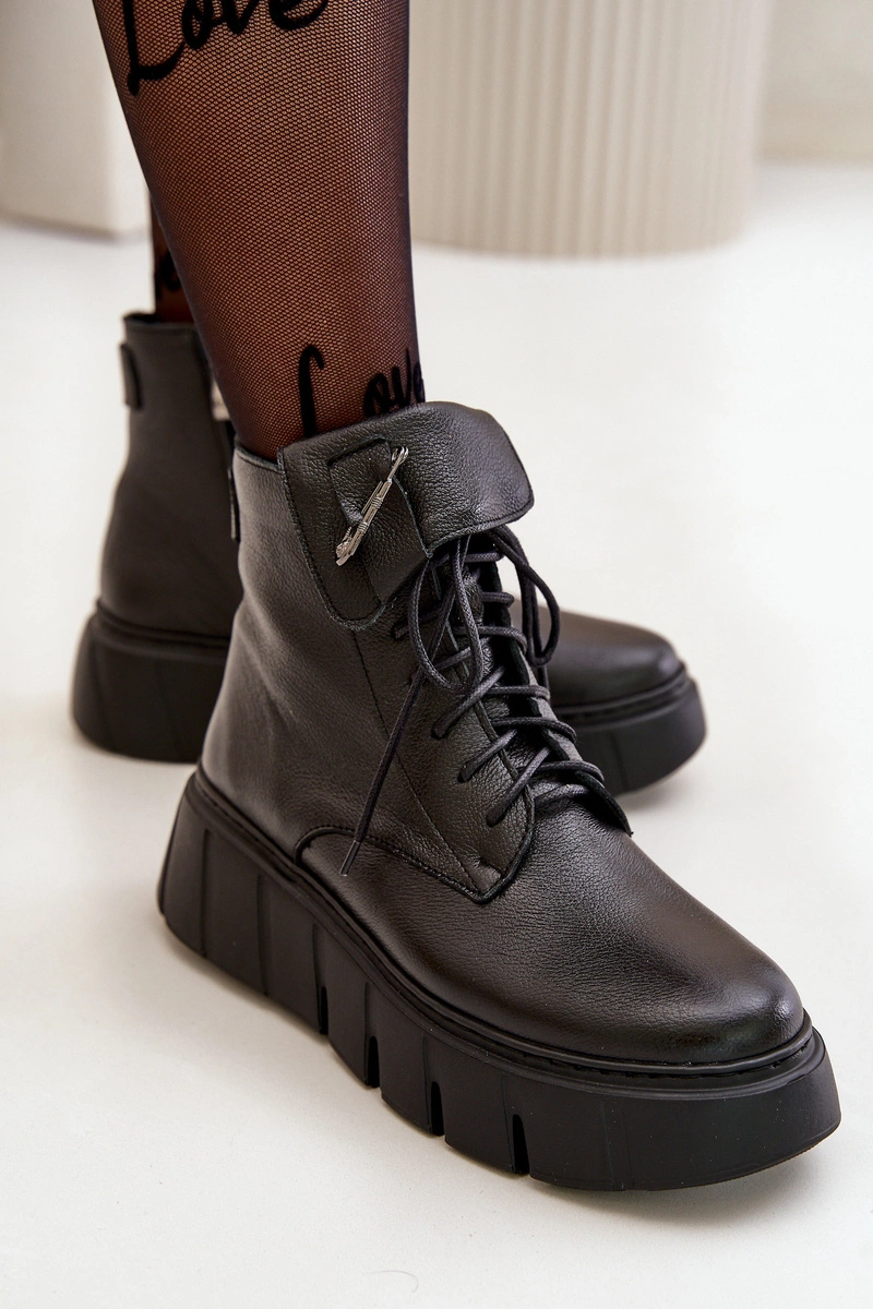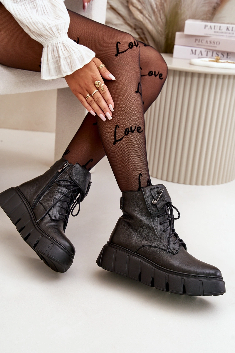 Zazoo 60511 Skórzane Botki Damskie Na Platformie Ocieplane Czarne